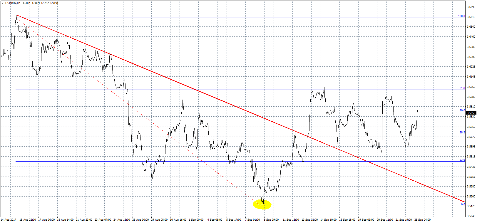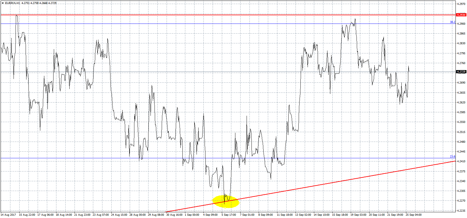 Niedługo miną dwa tygodnie, od kiedy dolar przełamał linię trendu spadkowego. Wydawało się, że da to silny impuls do dalszych wzrostów, tak się jednak nie stało. Co prawda kurs USDPLN, szybko dotarł do okolic 3,60 zł, tam jednak zadziałał jeden z poziomów fibo. Od tego czasu dolar porusza się w pięciogroszowej konsolidacji, nie mogąc obrać konkretnego kierunku. Z jednej strony w szerszej perspektywie widać, że amerykańska waluta jest cały czas raczej tania, z drugiej temat Korei widocznie przeszkadza “zielonemu”. Potencjalny konflikt z każdą kolejną wypowiedzią dygnitarzy staje się coraz bardziej realny. Dodając do tego FED, który chciałby podnosić stopy procentowe, ale boi się inflacji, otrzymujemy dolara, który tkwi w zawieszeniu i w oczekiwaniu na konkretne rozwiązania. Powoli zbliżamy się do lokalnych szczytów z 2012 roku, które zapewne będą wykorzystane jako silne wsparcie, tak więc dużo większy jest potencjał do ruchu w górę.