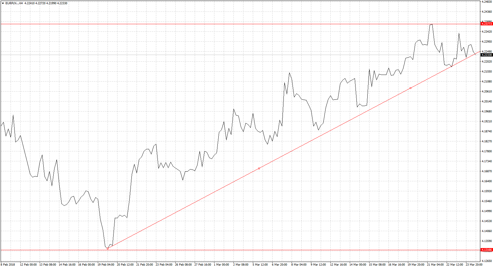 Początek tygodnia nie przynosi póki co większych zmian w wycenie EUR/PLN. Technicznie jednak nadal znajdujemy się w trendzie wzrostowym od poziomu ostatniego minimum czyli 4,1320. Mimo zdecydowanego wzrostu awersji do ryzyka w ostatnich dniach trend osłabiający złotego nieco wyhamował. Poprzedni tydzień wydawało się, że będzie pod znakiem posiedzeń banków centralnych. I owszem był z tym, że zszedł nieco na dalszy plan a gwiazdą tygodnia postanowił być znów prezydent USA. Po raz kolejny zaserwował rynkom niepewność. Zapowiedział kolejną porcję protekcjonizmu, który tym razem został ukierunkowany szczególnie wobec Chin. Szczegółów tak naprawdę jeszcze nie znamy, czego mogłyby dotyczyć ograniczenia w handlu. Niemniej jednak powoli już pojęcie wojny handlowej przybiera na sile. Trudno więc w obecnej chwili szukać czynników za odreagowaniem kursu i powrotem choćby w okolice 4,20. Zarówno podwyżka stóp w USA jak i zmniejszenie apetytu na ryzyko nie zachęcają do zajmowania pozycji w złotówce. Po stronie czynników wewnętrznych a więc gołębiej postawy RPP również raczej mamy do czynienia z czynnikami podażowymi. Wydaje się więc, że aktualny kierunek EUR/PLN to powinna być konsolidacja w rejonie 4,21-4,24.