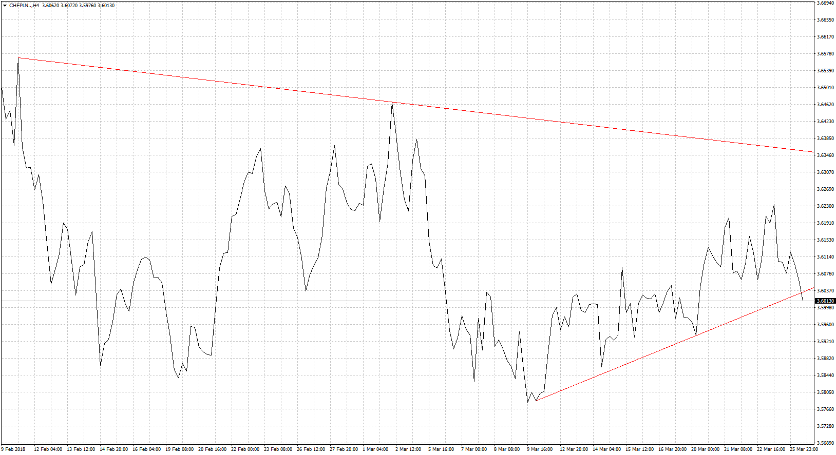 Mimo solidnej wyprzedaży na rynkach akcyjnych w ubiegłym tygodniu i tym samym awersji do ryzyka CHF/PLN utrzymał się w dość wąskim paśmie wahań. Jest to związane przede wszystkim z tym, że coraz odważniejsze pomysły Trumpa z wprowadzeniem nowych ograniczeń w handlu wywołały reakcję przede wszystkim na giełdach. Rynek walutowy te plany przetrawił nieco na chłodno i ucieczki do walut uznawane za bezpieczne nie było. Owszem jen japoński jest na poziomach nie widzianych od końca 2016 roku ale trzeba pamiętać, że jest to związane przede wszystkim z osobą S. Abe. Również sytuacja techniczna na parze EUR/CHF sprzyja ruchom na CHF/PLN. Jesteśmy powyżej 1,17 a więc i kurs CHF/PLN jest w okolicach 3,60. Obecnie testowane jest wsparcie w postaci linii krótkoterminowego trendu wzrostowego. Jeśli uda się pokonać poziom 3,60 i dodatkowo nastąpi odbicie na giełdach światowych to jest szansa na zejście niżej kilka groszy.
