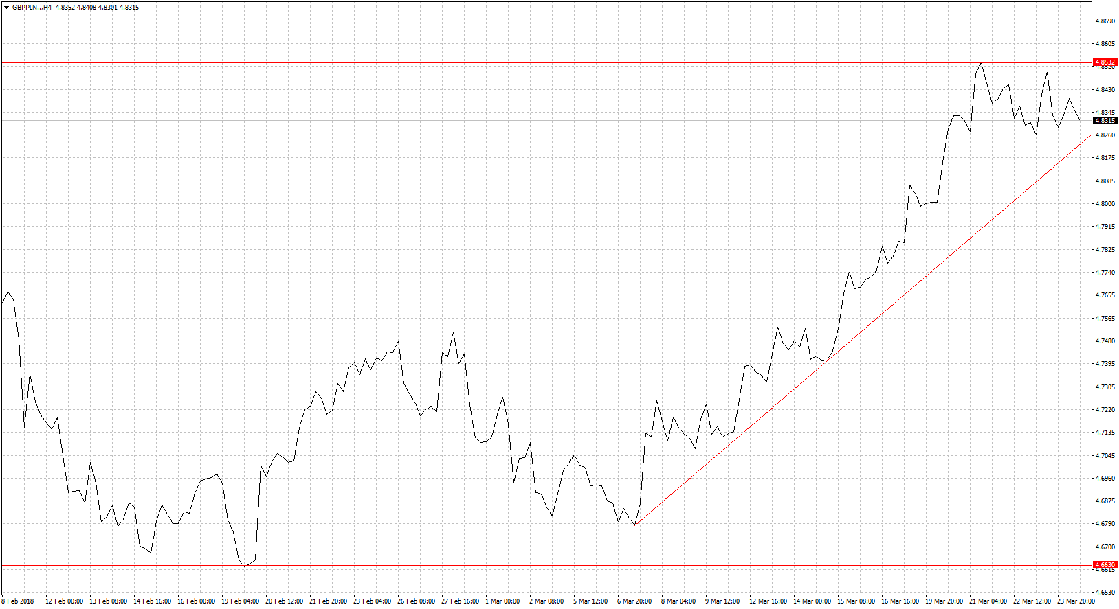 Zdecydowanie na fali w ostatnich dniach jest funt brytyjski. Tak naprawdę na rynek trafiają same pozytywy dla brytyjskiej waluty co pozwala jej się umacniać na szerokim rynku. Najpierw ku zaskoczeniu wszystkich okazało się, że negocjacje brexitowe przebiegają bardzo dobrze. Wielka Brytania doszła do porozumienia z UE co do okresu przejściowego. Pozostaje kwestia Irlandii ale wydaje się, że w tym momencie ważniejsze było uzyskanie dłuższego terminu dostępu do wspólnego rynku. Również funt dostał wsparcie ze strony Banku Anglii. Posiedzenie nie przyniosło co prawda zmian w polityce monetarnej ale rozkład głosów a mianowicie dwóch członków było za podwyżką stóp znacznie przybliżyło taki ruch już na kolejnym majowym zebraniu. Inwestorzy szybko więc zdyskontowali taki ruch w notowaniach funta. W efekcie GBP/PLN porusza się w dość dynamicznym trendzie wzrostowym, a ruch w samym marcu z 4,67 na maksimum 4,85 musi robić wrażenie. Trzeba też wspomnieć o danych z gospodarki, które również potwierdzają radzenie sobie w trudnym otoczeniu a więc wyjścia ze struktur UE.