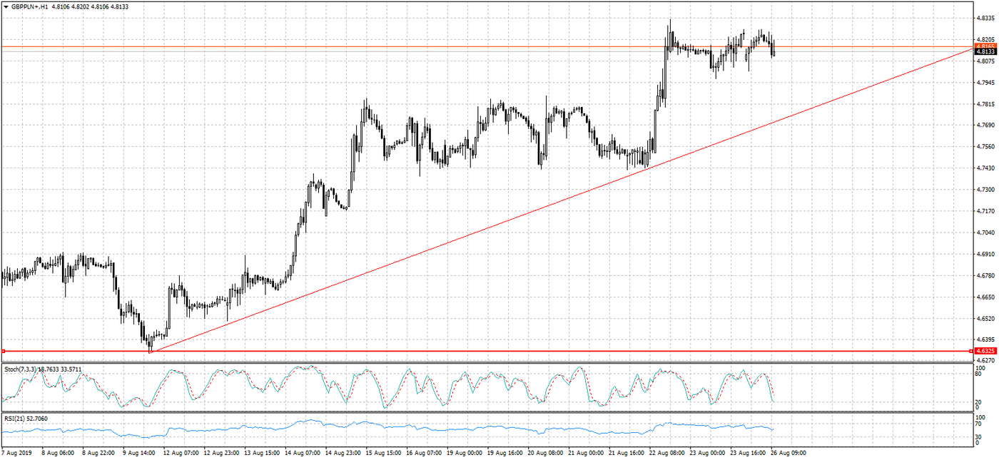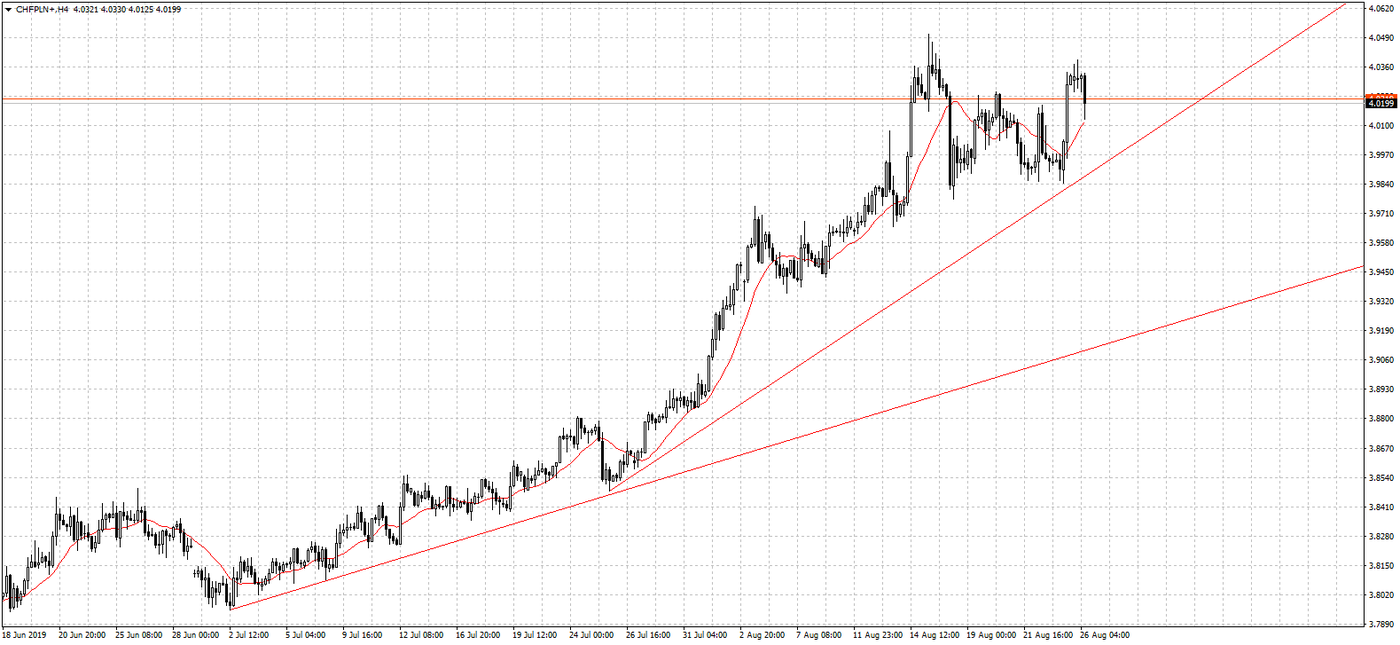 Na parze EURPLN nadal znajdujemy się w dość silnym trendzie wzrostowym. Pomimo ciążących na wspólnej walucie niepewnościach na rynku systematycznie umacnia się ona wobec złotówki. W ostatnim tygodniu sierpnia z punktu wyceny euro ważne będą doniesienia z Włoch, gdzie widmo przedterminowych wyborów jest coraz bardziej realne, po tym jak rozpadła się rządząca koalicja. Konsekwencje dla notowań EURPLN mają również doniesienia z frontu wojny handlowej i coraz bliższy termin brexitu. W tym tygodniu zmienność na tej parze walutowej wzmocnią również odczyty makroekonomiczne. Poznamy bowiem odczyty PKB z Niemiec, Francji oraz Polski. Dodatkowo warto zwrócić uwagę na publikacje dynamiki inflacyjnej w państwach europejskich, które będą miały miejsce pod koniec tygodnia.