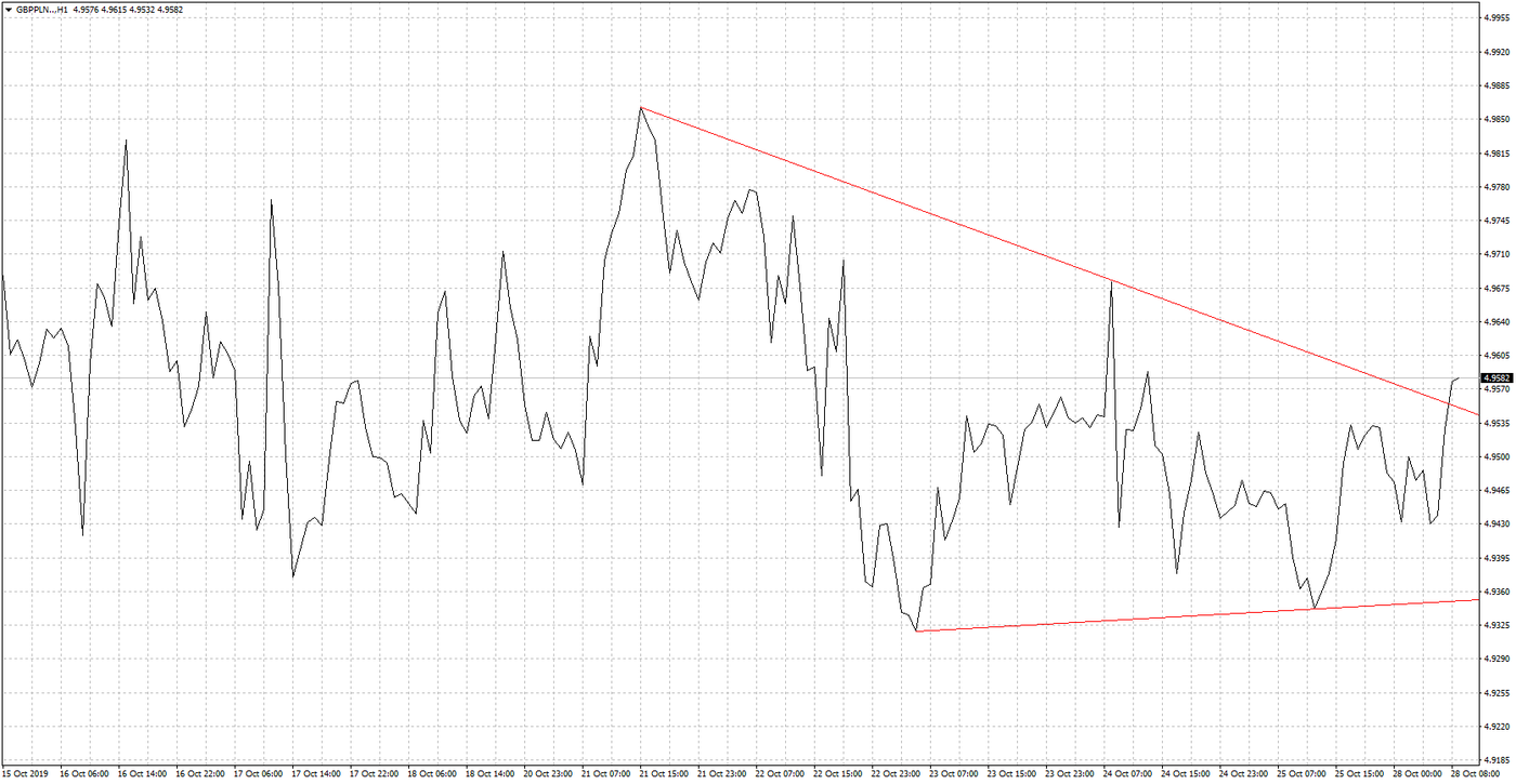 Tylko nieco spokojniej w sprawie brexitu. Teoretycznie wiemy nieco więcej niż jeszcze choćby tydzień temu. Rynki spodziewały się, że Izba Gmin nie pozwoli na wyjście z UE z końcem października. Mimo tego premier Boris Johnson i tak może triumfować, ponieważ w końcu komuś udało się przeforsować do dalszego procedowania wynegocjowaną umowę wyjścia (Withdrawal Agreement Bill – WAB). Dzisiaj unijni włodarze zdecydowali się, być może po raz ostatni, przedłużyć termin brexitu. Nowa data to koniec stycznia 2020 roku. Dlaczego ostatni raz? Coraz bardziej rośnie presja krajów członkowskich, aby temat wreszcie doprowadzić do końca. Bardzo niezadowolony z ciągnących i niekończących się negocjacji jest np. prezydent Francji Emmanuel Macron. Należy przypomnieć, że na przedłużenie musi się zgodzić wszystkie 27 państw unijnych. Brytyjska strona oczywiście zostawia sobie opcję wcześniejszego wyjścia, jeśli uda się szybciej dopełnić wszystkich formalności (mowa o tzw. “flextension). Moglibyśmy stwierdzić, że teoretycznie bardzo dużo czynników gra na korzyść funta. Jest jednak jedno poważne “ale”. Johnson po swoim osobistym sukcesie w przeforsowaniu WAB nie chce się zatrzymywać i zaproponował wcześniejsze wybory. Dzisiaj poznamy decyzję parlamentu w tej kwestii. Kampania wyborcza w tak gorącym okresie to duża dawka niepewności, tym bardziej że główna oś sporu może dotyczyć dwóch opcji: wyjście z UE na obecnie wynegocjowanych warunkach albo kolejne referendum, w którym to obywatele mieliby poprzeć lub odrzucić ten projekt. Za drugą możliwością mocno optuje opozycja. Czynnik ryzyka w postaci nowych wyborów zablokował nieco wzrosty na GBP. Sytuacja techniczna na funcie sugeruje jakieś większe wybicie w tym tygodniu. Chodzi o formację trójkąta, która jest widoczna na wykresie. Układ wydarzeń, czyli głosowanie o przedłużeniu brexitu i rozpatrywanie projektu wcześniejszych wyborów, może sprzyjać takiemu scenariuszowi.