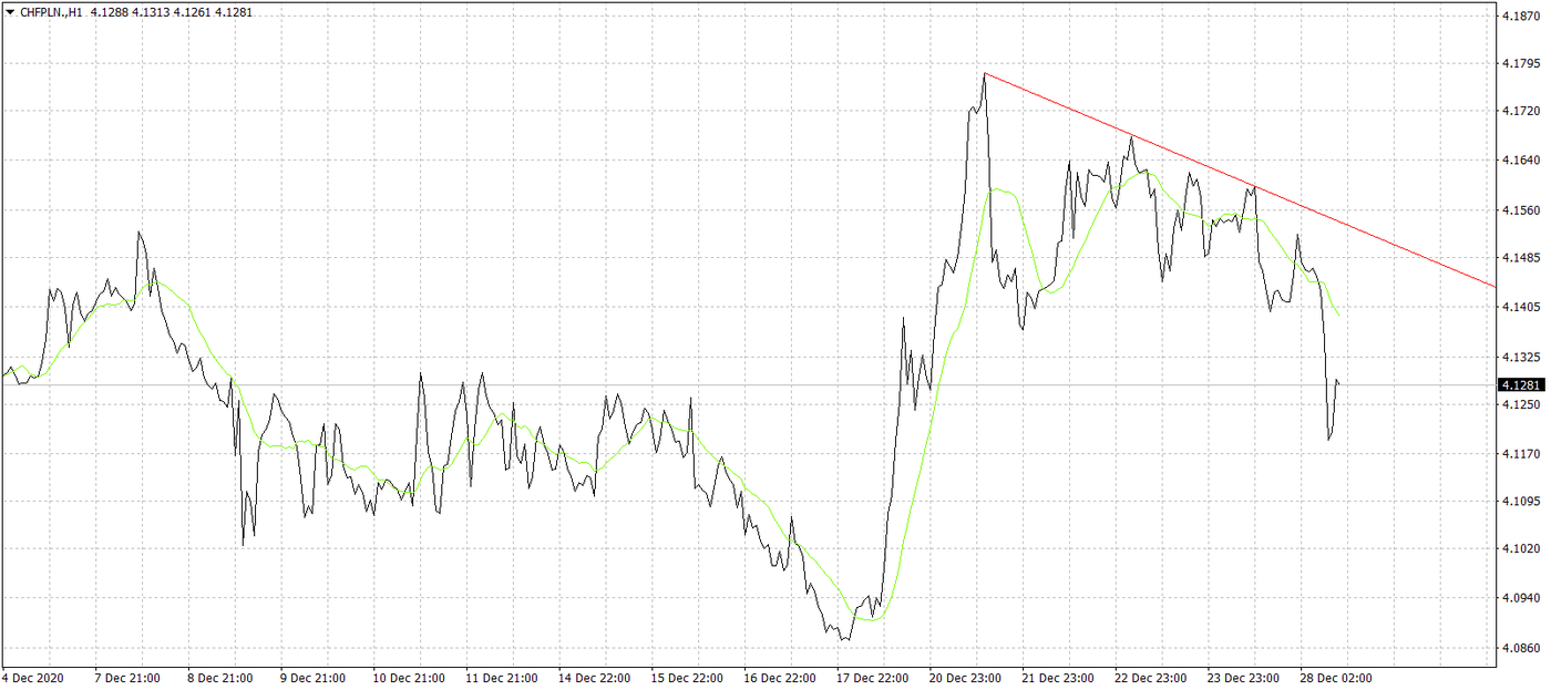 Nieco lepiej wygląda sytuacja na parze CHF/PLN. Kurs od ostatniego maksa schodzi niżej o ponad 5 groszy. Z jednej strony to zasługa mocnego euro w relacji do CHF, gdzie notujemy poziomy bliskie 1,09, z drugiej zaskakujące dogadanie się Wielkiej Brytanii z UE, które zamknęło temat brexitu bez umowy, co w obecnym pandemicznym otoczeniu jest bez wątpienia dobrym rozwiązaniem dla wszystkich. Technicznie na wykresie obserwujemy trend spadkowy i tylko przebicie wyrysowanej linii mogłoby skutkować zmianą kierunku. Jeśli nastroje na rynkach się utrzymają (a jest na to spora szansa), to możemy być świadkami spadku kursu jeszcze niżej, gdzieś w okolice minimum z połowy grudnia.