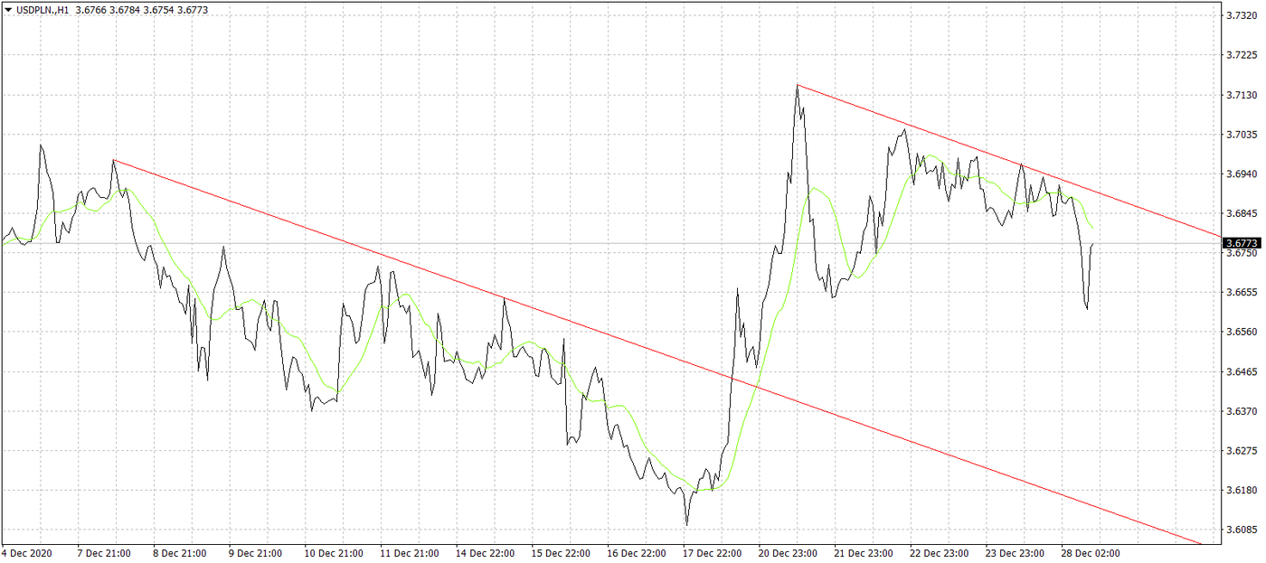 Skoro mowa o szampańskich nastrojach, to nie dziwi spadek kursu USD/PLN. Ostatnimi czasy amerykańska waluta jest wyprzedawana w przypadku rynkowego risk on. Paliwa do wzrostu dodała informacja o tym, że Trump jednak podpisał ustawę fiskalną, w ramach której pomoc uzyskają Amerykanie, np. w formie jednorazowego bonu o wartości 600 USD. Obecny prezydent straszył wetem, ale oczywiście, gdy przyszło co do czego, to szybko się wycofał i jednak parafował pakiet pomocowy. Trump chciał zwiększenia kwoty bonu do wartości 2000 USD, co spotkało się z krytyką nawet jego własnej partii, a więc Republikanów. Finalnie jednak kończący kadencję mieszkaniec Białego Domu nie chciał sobie strzelić wizerunkowo w stopę i zgodził się na jakąkolwiek formę pomocy, szczególnie że jej ustalanie trwało nadspodziewanie długo, a obie partie mocno rozjeżdżały się w kwotach pomocy. EUR/USD utrzymuje się nadal powyżej 1,22 i nie wydaje się, by do końca roku się to zmieniło. W efekcie krótkoterminowy trend wzrostowy, widoczny na notowaniach, USD/PLN powinien się utrzymać i możliwy jest spadek do minimów widzianych w połowie grudnia, gdzieś na poziomach 3,61.