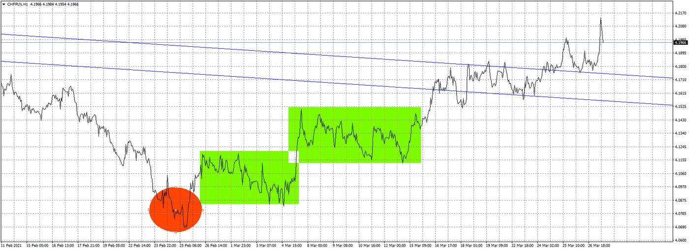 Wykres kursu franka do złotego, interwał 1-godzinowy