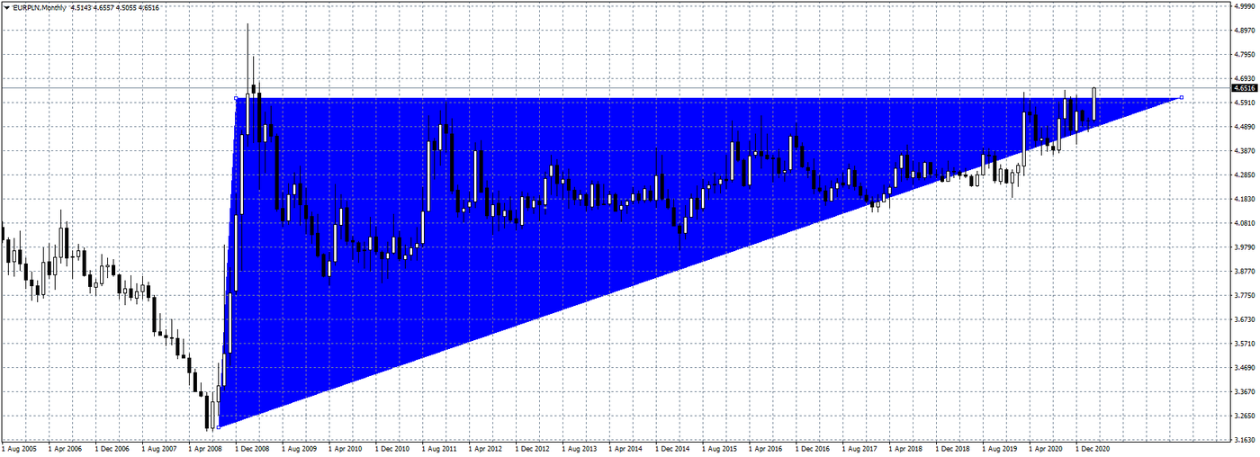 O tym, w jak fatalnej kondycji jest nasz złoty, najlepiej świadczy zestawienie go z euro. Wspólna waluta ma szereg własnych problemów przede wszystkim związanych z trzecią falą epidemii koronawirusa. Do tego dochodzą kolejne kłopoty z funduszem odbudowy, który raz po raz się opóźnia. Euro w stosunku do dolara potaniało o przeszło 5 centów w ostatnim czasie, a i tak jest najdroższe względem złotego od 12 lat (!!!), czyli od momentu kryzysu subprime z 2008 roku. W międzyczasie poziom 4,60 zł był wielokrotnie testowany, jednak ani razu nie zdarzyło się, by świeca miesięczna zamknęła się powyżej tego pułapu. Teraz prawdopodobnie tak właśnie będzie. Słabość złotego jest już dostrzegana przez światowe media, zwłaszcza że gorzej od naszej zachowuje się tylko turecka waluta, która znajduje się w permanentnym kryzysie. Złotemu zapewne nie pomoże nawet spodziewana korekta na głównej parze walutowej świata. My dopiero wchodzimy w twardy lockdown, oraz znajdujemy się na szarym końcu listy państw w rankingach radzenia sobie z pandemią (ostatnio aktualizację opublikował choćby Bloomberg). Do tego krótkowzroczne działania rodzimej RPP mocno ciążą złotemu. I tak jak jestem w stanie sobie wyobrazić odwrócenie trendu na parze z dolarem, tak o podobny scenariusz z euro może być już ciężko.