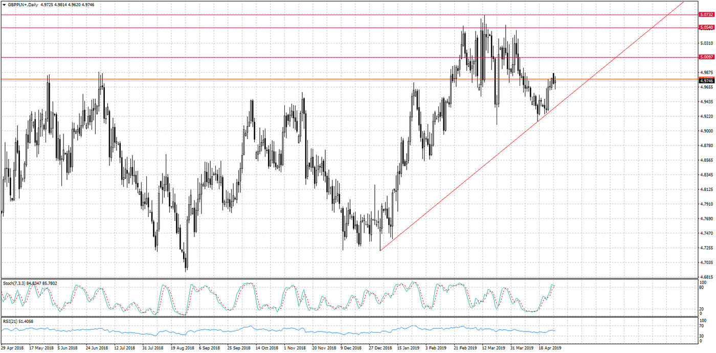 Po decyzji przedstawicieli Unii Europejskiej (przynajmniej na chwilę) ucichły plotki i doniesienia związane z brexitem, a wraz z tym zmniejszyły się wahania na parach powiązanych z funtem. W tym tygodniu odbędzie się posiedzenie członków Banku Anglii, którzy będą decydować o wysokości stóp procentowych. Analitycy zgodnie twierdzą, że do czasu faktycznego opuszczenia przez Wielką Brytanię szeregów wspólnoty, brytyjskie władze monetarne powstrzymają się z jakimikolwiek decyzjami. Na początku tygodnia można zakupić brytyjską walutę po 4,97 zł.