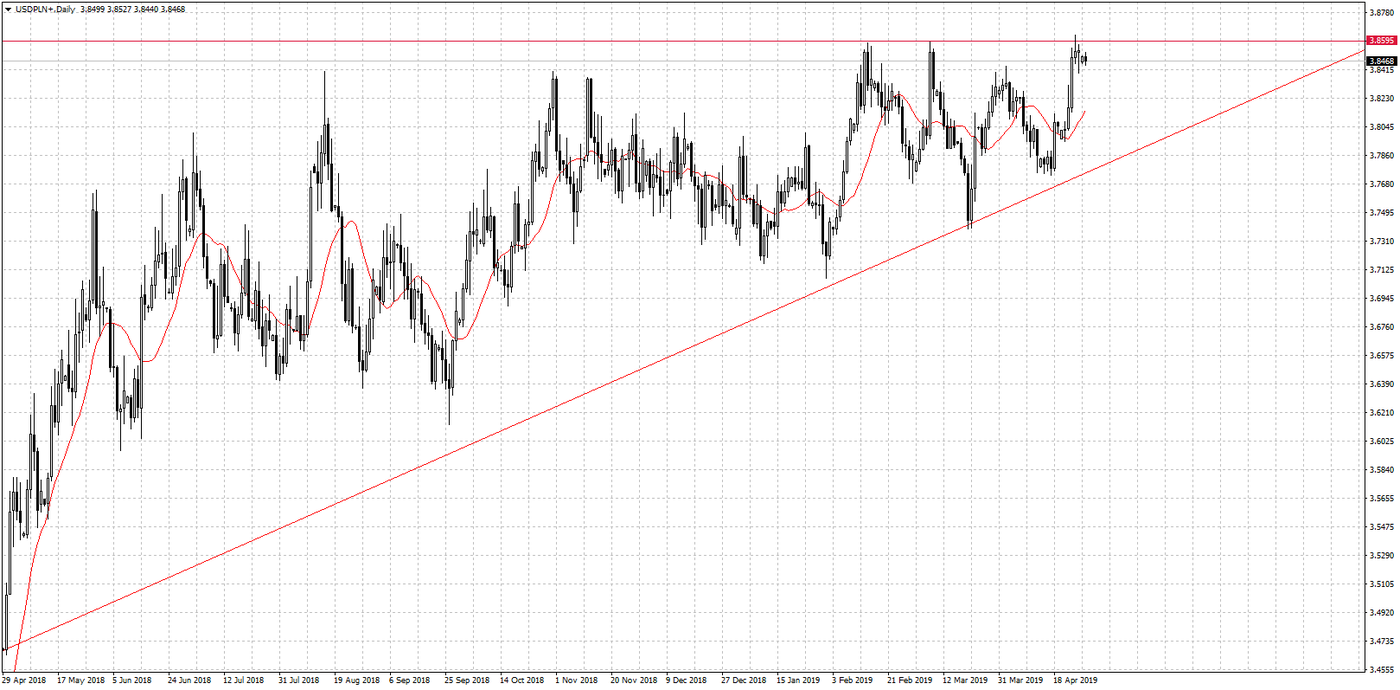 Notowania złotówki w stosunku do franka szwajcarskiego przedstawiają się podobnie jak wykres EUR/PLN. W połowie kwietnia została przetestowana linia oporu na poziomie 3,72 zł, a następnie cena franka zaczęła rosnąć. Jeżeli na rynkach dłużej utrzyma się awersja do ryzyka, kurs CHF/PLN może napotkać poważniejszy opór dopiero na poziomie 3,85 zł. Nagły zwrot tendencji może nieco dziwić, ponieważ w ostatnim czasie ucichły wszystkie istotne spory. Warto zatem przyglądać się uważniej “majówkowym” danym, które mogą pokazać, czy zeszłotygodniowy ruch w górę był tylko korektą, czy też może początkiem silniejszego trendu.