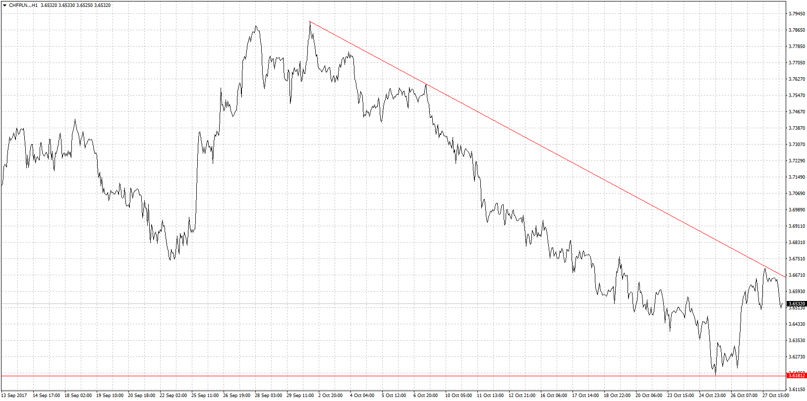 Na wykresie CHF/PLN nadal poruszamy się w trendzie spadkowym. Mimo wszystko jednak od ostatniego minimum jesteśmy kilka groszy wyżej. Kurs testował nawet ograniczenie linii trendu spadkowego. Póki co próba zakończyła się niepowodzeniem. Ruch korekcyjny w trendzie spadkowym wynikał prawdopodobnie z sytuacji na EUR/CHF. Posiedzenie EBC znacznie osłabiło wspólną walutę więc i na parze z frankiem szwajcarskim euro traciło. W takiej sytuacji i złotówka nieco straciła. Wydaje się jednak, że sytuacja póki co się uspokoiła i patrząc na kiepskie fundamenty franka szwajcarskiego, niska inflacja, słaby wzrost gospodarczy, kurs CHF/PLN powinien się raczej ustabilizować. Trzeba jednak pamiętać o sytuacji na linii Madryt-Barcelona, która nadal jest napięta. Oporem w przypadku wzrostów będzie wspomniana linia trendu spadkowego natomiast wsparciem ostatnie minimum w okolicach 3,6180.
