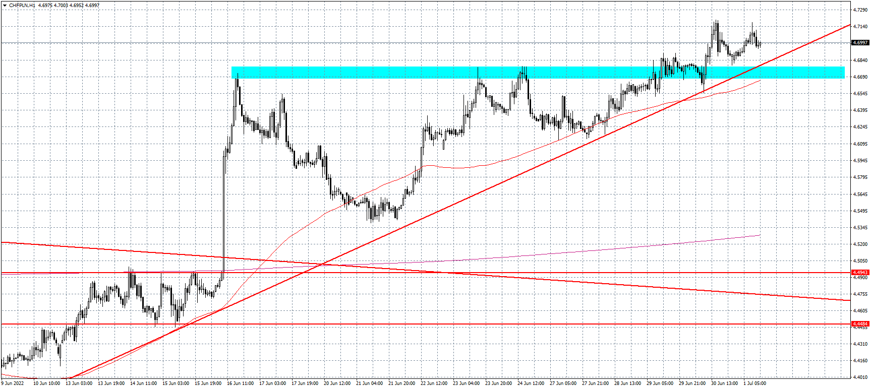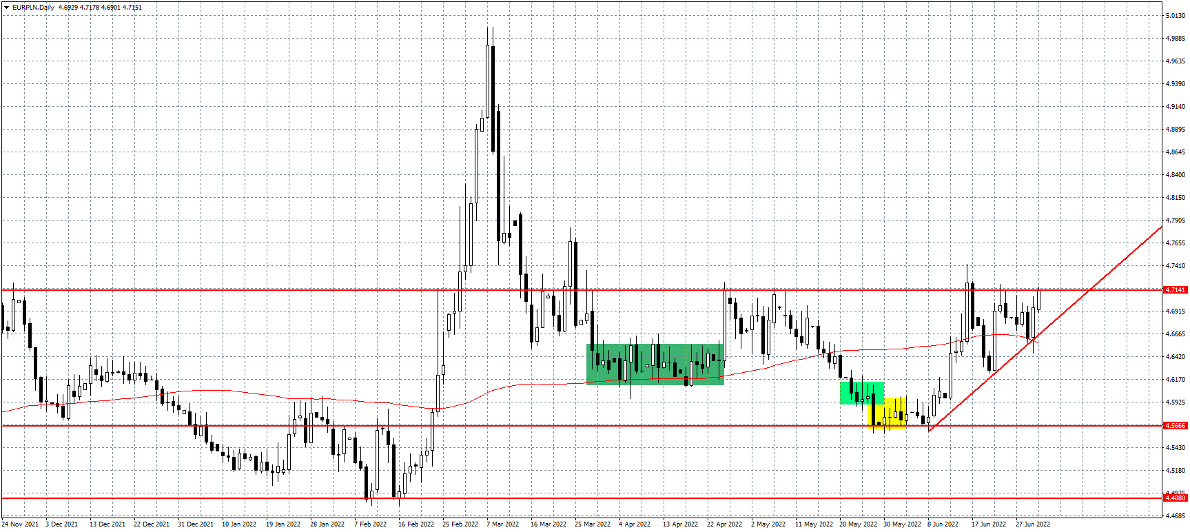 Najsłabiej sytuacja wygląda względem szwajcarskiego franka. Jeśli komuś się wydawało, że po podwyżce stóp procentowych przez Helwetów doszliśmy do jakichś absurdalnych poziomów, których już nigdy więcej nie zobaczymy, to niestety, ale mocno się zawiódł. Z pewnym mozołem, ale ostatecznie w końcu udało się odejść od tamtych szczytów na dystans 13 groszy. Rzecz w tym, że od tamtej pory złoty konsekwentnie osuwa się względem franka. Finałem tego jest nie tylko dojście do omawianych szczytów przy 4,67 zł, ale również ich pokonanie. Suma sumarum doszliśmy do poziomu 4,72 zł i wiele wskazuje na to, że to nie koniec rajdu na północ. Warto pamiętać, że praktycznie od początku czerwca znajdujemy się w intensywnym trendzie wzrostowym, który ma coraz mniej przeszkód na swojej drodze. Dodatkowo ostatnie wypowiedzi polskich ekonomistów przede wszystkim powiązanych z obozem rządzącym, sugeruje, że dość szybko może zabraknąć fundamentalnego wsparcia w postaci podnoszenia stóp procentowych. W ostatnich dniach coraz łatwiej natknąć się na różne publikacje wskazujące, że inflacje to my w sumie już pokonaliśmy i teraz pora zacząć się zastanawiać nad obniżaniem kosztu pieniądza. Sęk w tym, że inflacja nic o tym nie wie i dzisiejszym odczytem pokonała barierę 15%.