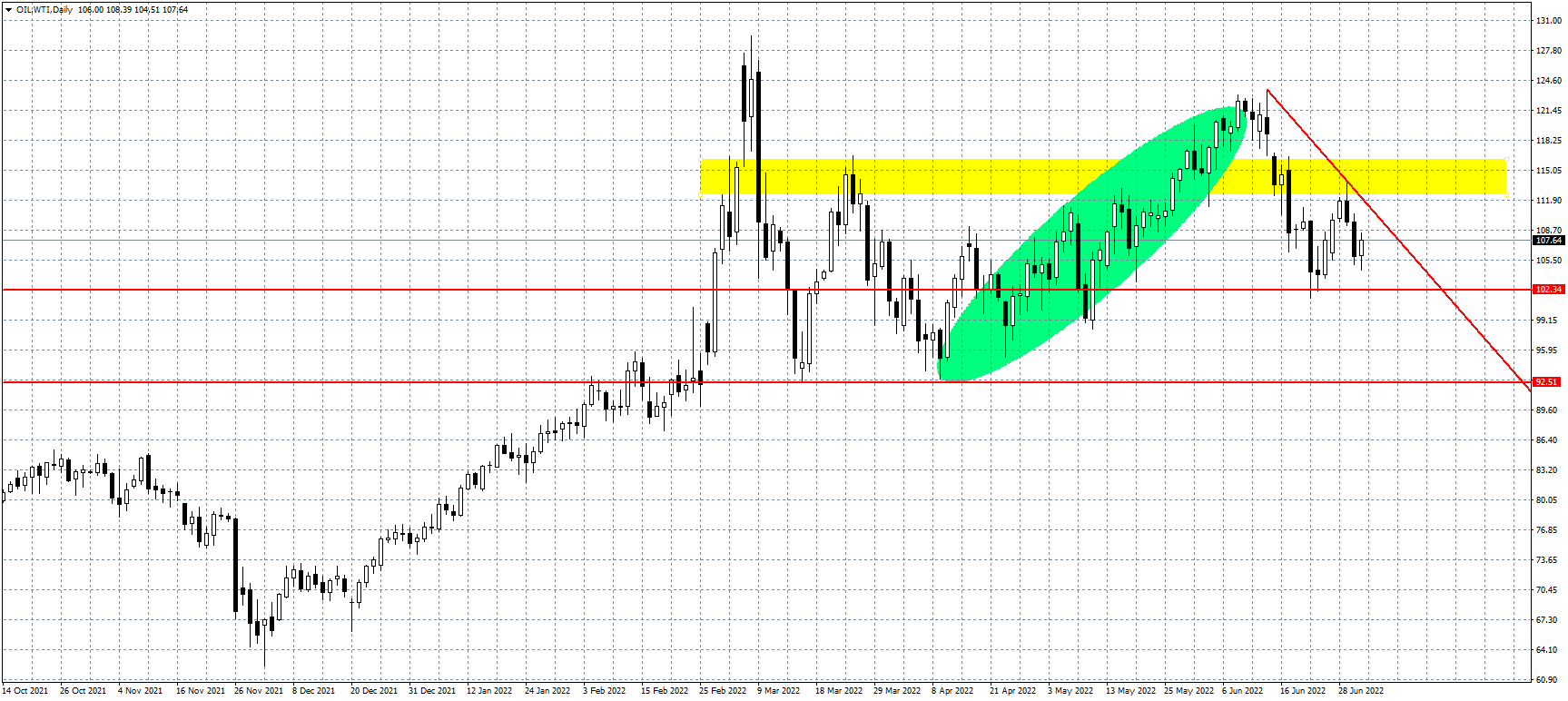 Nie wszystko jednak maluje się w totalnie czarnych barwach. Na rynku ropy mamy potwierdzenie krótkoterminowego trendu spadkowego, który powinien przynieść chwilę oddechu dla głównych banków centralnych na świecie. Dużo spekulowano, czym miał być zeszłotygodniowy ruch w górę, w pewnym momencie wyjątkowo mocne były obawy, że wracamy do trendu wzrostowego. Ostatecznie jednak wygląda na to, że podejście pod 115 $, było zaledwie korektą wcześniejszych spadków. Daleko jeszcze do odtrąbienia sukcesu, kluczowy w tym wszystkim będzie pułap 102 $, dopiero jego pokonanie da wyraźny sygnał, że rekordy na ropie w najbliższym czasie nam nie grożą. Dodatkowo wyłamanie tego poziomu da pretekst, by spróbować zejść aż w okolice 92,5 $, co by było już mocnym wsparciem w walce z inflacją. Warto jednak pamiętać, że fundamentalnie trwa duże zamieszanie nie tylko wokół rosyjskiej ropy, ale również względem tej z Libii czy Ekwadoru.