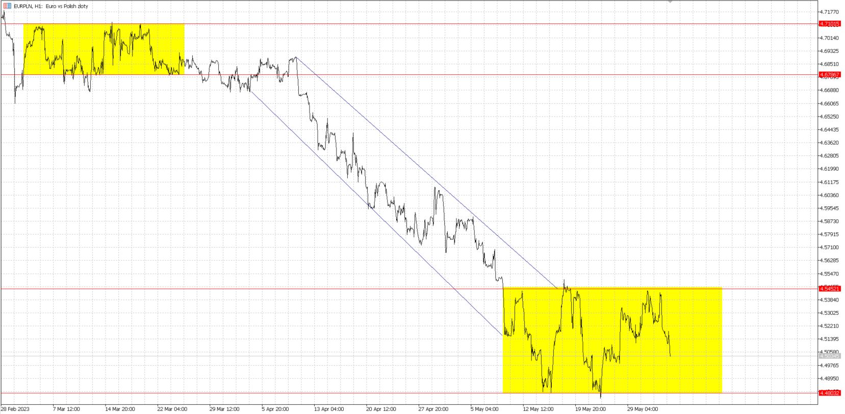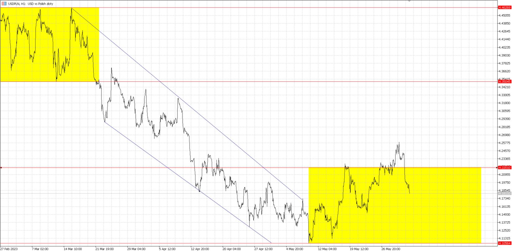 Majowego trendu spadkowego nie możemy zauważyć na wykresie złotego do unijnej waluty. Co prawda, kwietniowe spadki są widoczne, to jednak wyhamowały one wraz z początkiem nowego miesiąca. Następnie znajdowaliśmy się w konsolidacji. Najniżej na EUR/PLN znaleźliśmy się w połowie maja, dwa razy testując wsparcie 4,48 PLN. Górną granicą kanału jest opór 4,545 PLN, którego niejedna próba wybicia zakończyła się niepowodzeniem. W piątek o godzinie 14:00 EUR/PLN schodzi poniżej poziomu 4,50 PLN, jednak cały czas mieści się to w granicach wspomnianego wcześniej trendu horyzontalnego.