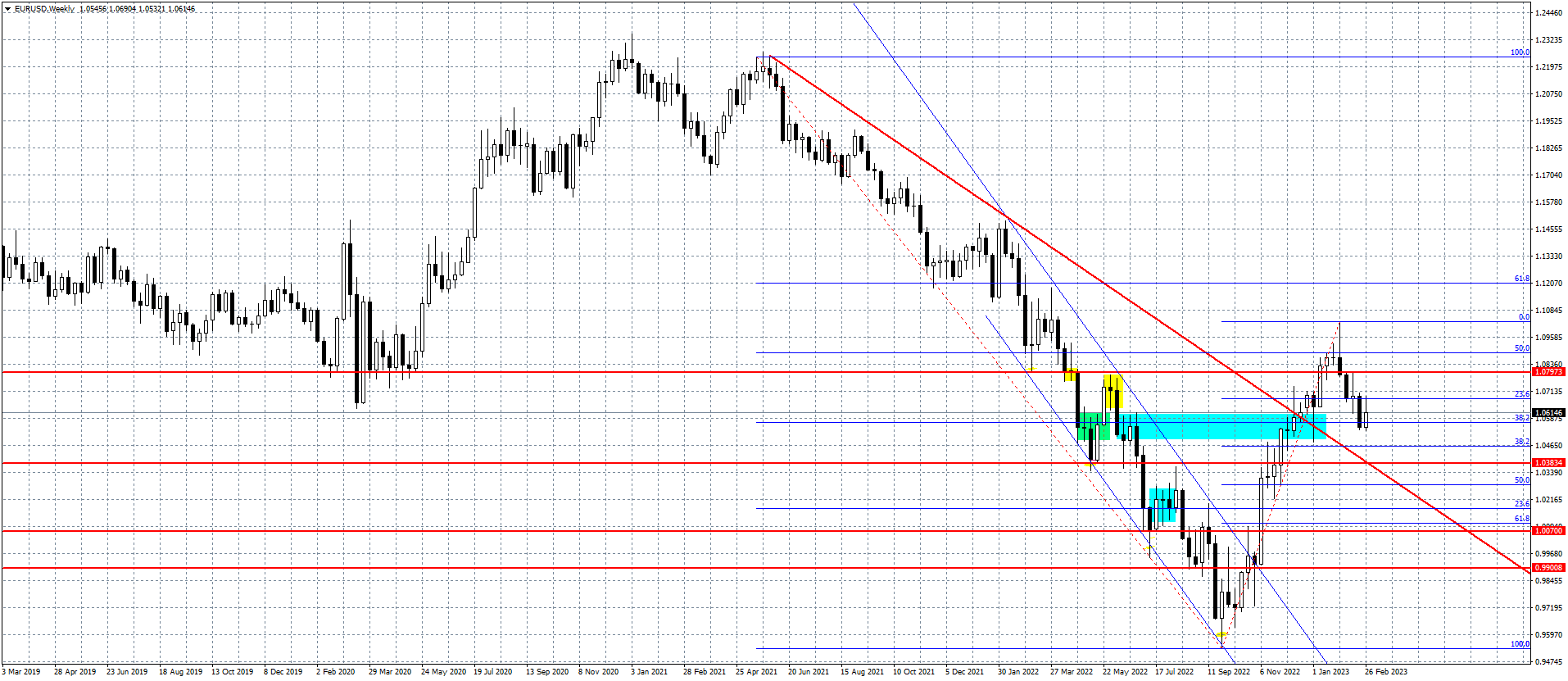 Wykres kursu euro do dolara, interwał 1-tygodniowy