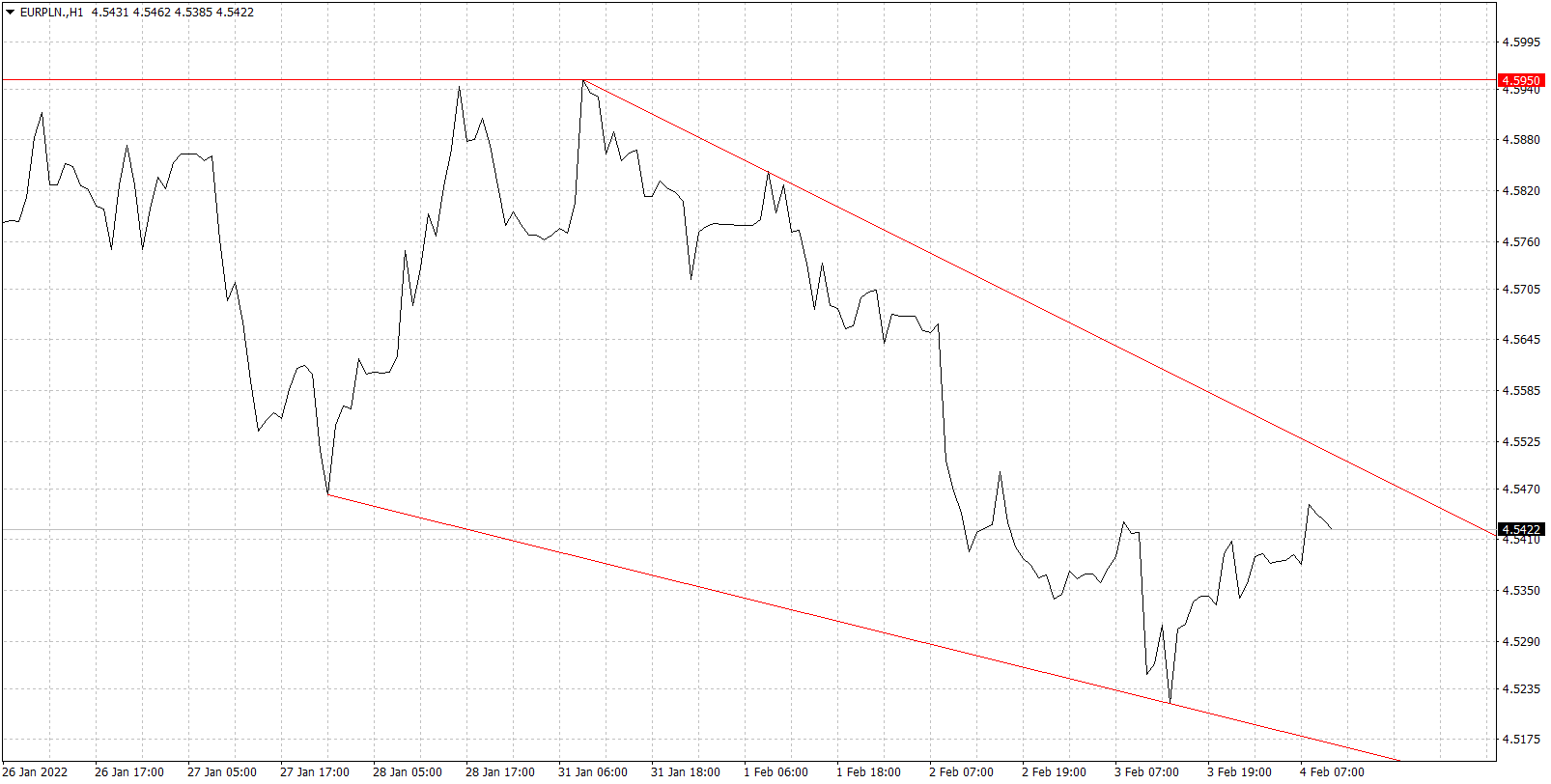 EUR/PLN od kilku dni znajduje się w trendzie spadkowym. Złoty przeszedł do ofensywy po chwilowej zapaści związanej z napięciem na granicy rosyjsko-ukraińskiej. Nie znaczy to, że eskalacja konfliktu już się nie wydarzy, bo ciągle w mediach pojawiają się nowe newsy o tym, kiedy armia Rosji wkroczy na teren Ukrainy. Jeśli tak by się faktycznie stało, to słowo panika będziemy odmieniać przez wszystkie przypadki, a krajowa waluta mocno ucierpi. Póki jednak sytuacja jest spokojna, złoty korzysta i umacnia się do euro. Pomaga też odwrót dolara amerykańskiego na szerokim rynku, który sprzyja apetytowi na ryzyko i wspiera naszego “orła”. Z czynników wewnętrznych na plus dla naszej waluty działa prowadzona polityka monetarna i spodziewana już za kilka dni kolejna podwyżka stóp procentowych w Polsce. Patrząc przez pryzmat techniki, wsparcia dla kursu EUR/PLN należy szukać na poziomie 4,50.
