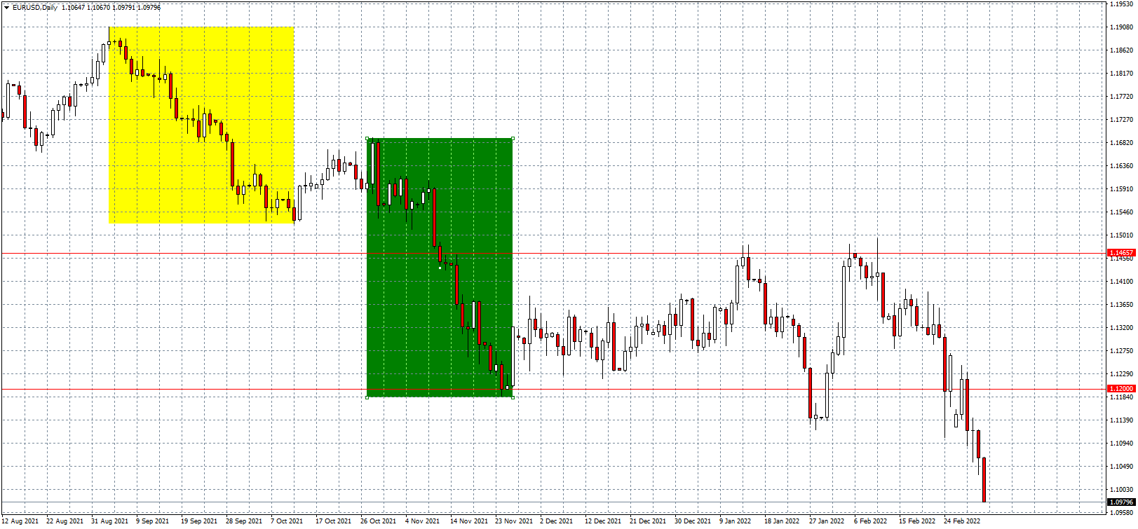By lepiej zrozumieć skalę ucieczki kapitału do bezpiecznych przystani warto zwrócić uwagę na kurs głównej pary walutowej świata. Euro nie jest uznawane za aktywo szczególnie ryzykowne, wręcz jest w gronie jednych z najstabilniejszych na świecie. A jednak ostatnie dni przynoszą niespotykaną dotąd przecenę w stosunku do dolara. Długo spekulowano, że poziom 1,1$ jest absolutnie nie do sforsowania, mimo całej nieudolności EBC. Ostatnie godziny pokazują jednak, że na rynku forex nie ma już żadnych świętości. Wspólna waluta od dłuższego czasu przeżywa ciężki okres, jednak ostatni tydzień to prawdziwa kapitulacja. Ostatni raz eurodolar był tak nisko w maju 2020 roku i wiele wskazuje na to, że w najbliższym czasie możemy pokusić się o testowanie dołka z tamtego okresu przy 1,06$. Byłby to czarny scenariusz dla złotego, który jest istotnie odwrotnie skorelowany z ruchami na tej parze.