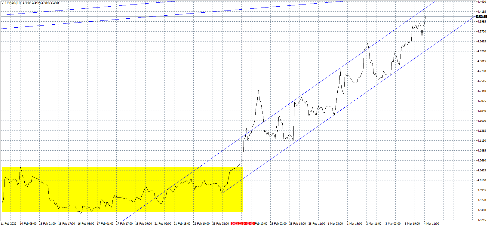 W tym tygodniu nie ma najmniejszego sensu analizować poszczególnych wykresów na złotym. Każdy z nich praktycznie wygląda dokładnie tak samo. Do 24 lutego mamy coś, co w perspektywie czasu i późniejszych ruchów wygląda jak konsolidacja, by później rozpocząć rajd bez trzymanki. Od początku rosyjskiej inwazji na Ukrainę, złoty dynamicznie traci, wychodząc na wieloletnie maksima, a w przypadku szwajcarskiego franka nawet na historyczne szczyty. Obecna sytuacja zmusiła nawet nasz bank centralny do redefinicji swojego podejścia do oceny siły złotego i po raz pierwszy od początku kadencji bieżącej RPP, zdecydowali się na interwencje walutowe, mające na celu obronę wartości PLN. Niestety okazało się, że taka obrona jest znacznie trudniejsza od sztucznego osłabiania waluty, w którym do tej pory Rada się specjalizowała. Kolejne interwencje przynoszą ulgę na coraz krótszą chwilę, a prawdopodobnie kosztują coraz więcej.