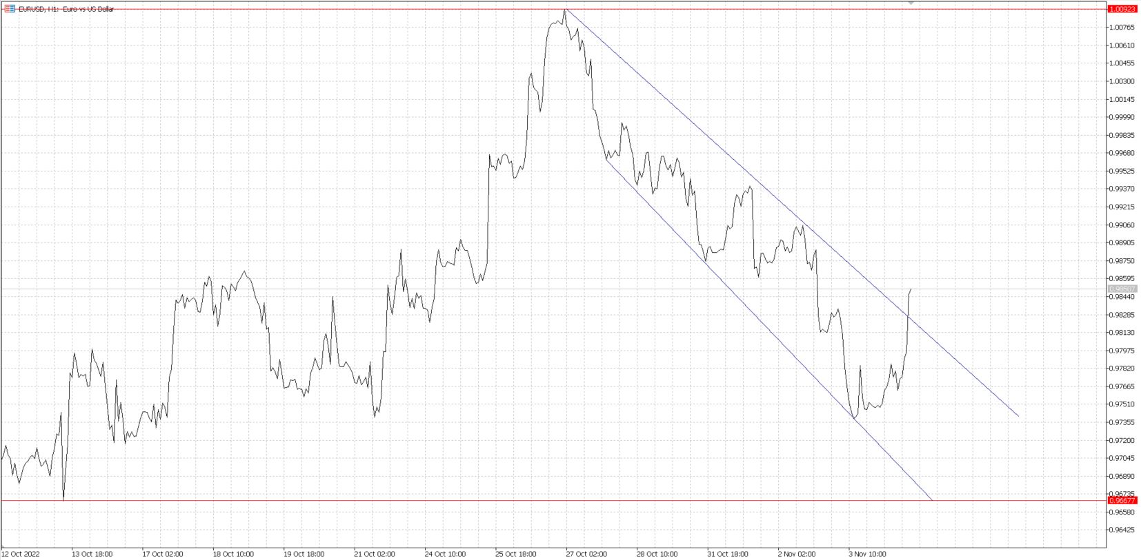 Wykres EUR/USD cały czas znajduje się poniżej parytetu. Co prawda, psychologiczna granica została dotknięta 27 października, jednak decyzja Europejskiego Banku Centralnego z tamtego właśnie dnia nie zdołała umocnić euro i wyprowadzić kursu powyżej 1 USD. W tym tygodniu główna para walutowa świata przez większość czasu poruszała się w kanale spadkowym. Trwało to do dziś, do godziny 13:30, kiedy to otrzymaliśmy wcześniej wspomniane dane z amerykańskiego rynku pracy. Kurs dolara osłabił się względem wspólnej waluty. Przebiliśmy nawet górną granicę wcześniej wspomnianego kanału spadkowego. W trakcie pisania analizy, kurs EUR/USD wynosi 0,985 USD. Mając na uwadze słowa wypowiedziane na konferencjach po decyzjach EBC i FED to amerykańscy decydenci są bardziej jastrzębio nastawieni do dalszego prowadzenia polityki monetarnej od europejskiego gremium.