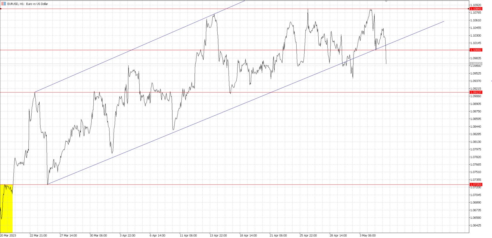 Wykres kursu euro do dolara, interwał 1-godzinowy