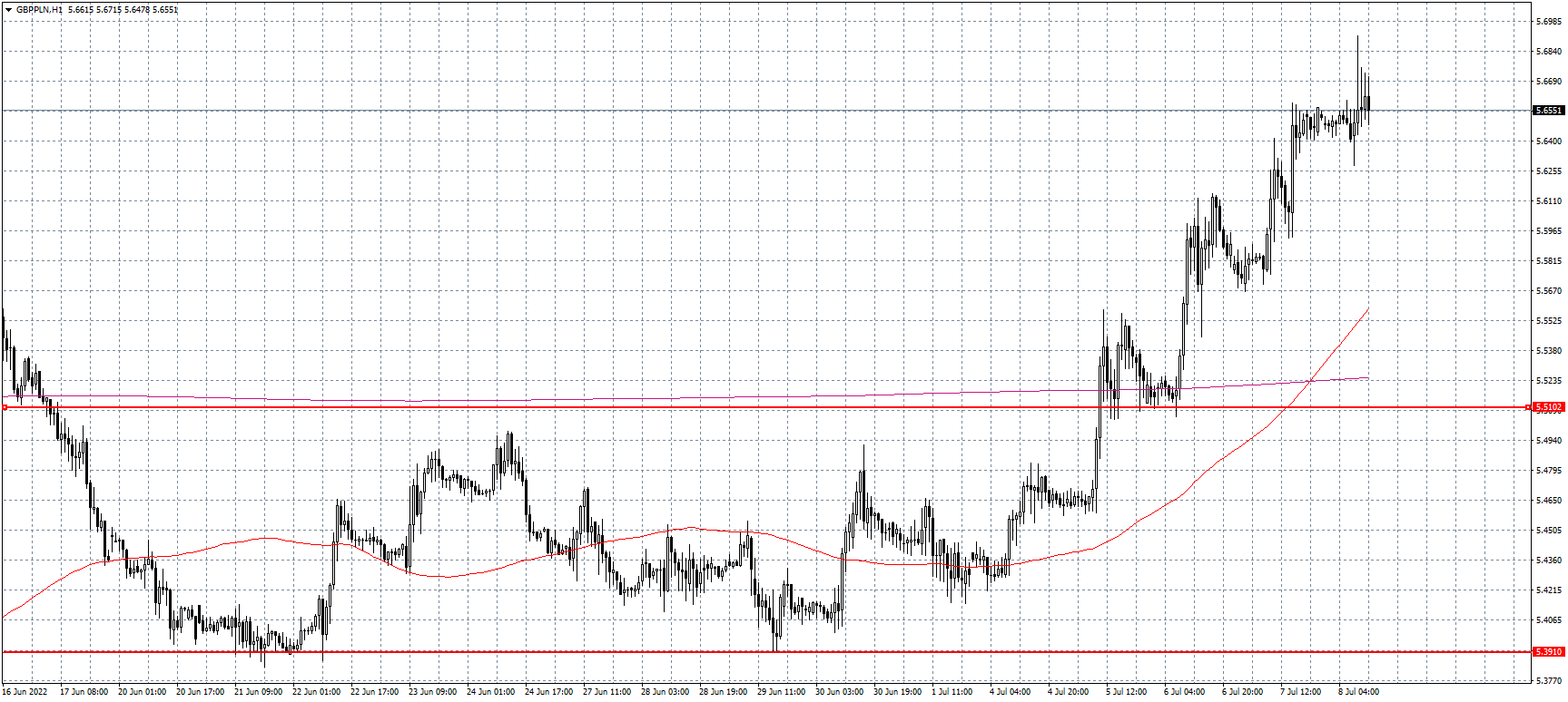 Oprócz dolara ostatnio w wyśmienitej formie jest także funt brytyjski. Ten drugą część czerwca spędził w miarę szerokiej konsolidacji między 5,40 zł a 5,51 zł. Kluczowym momentem okazało się nieudolne testowanie dolnego ograniczenia z 29 czerwca, od tego momentu obserwujemy wyraźny trend wzrostowy na szterlingu. Najpierw dość szybko udało się pokonać dystans konsolidacji i choć początkowo wyglądało, że opór kolejny raz da radę utrzymać kurs w ryzach, tak już na początku lipca doszło do wybicia. Potem mieliśmy jeszcze klasyczny retest, gdy po wyjściu 5 groszy w górę szybko wróciliśmy do przełamanego oporu, by na nowo rozpędzić ruch na północ. Wydaje się, że w ostatnim czasie żadna inna formacja nie ma takiej regularności, jak właśnie retesty po wybiciu. Od tego momentu obserwujemy piękny trend wzrostowy, który mimo swojej dynamiki i skrajnego nachylenia, wciąż respektuje lokalne korekty i powroty do wcześniejszych szczytów. Po prostu klasyka analizy technicznej. Ciekawie za to wygląda sytuacja z ostatnich godzin. Długie knoty świec sygnalizują, że mamy próbę zawiązania obrony przed dalszą przeceną złotego, dodatkowo widzimy objęcie kolejnych świec, wiele wskazuje na to, że impet może zostać wytracony. Zwłaszcza że ostatnie ruchy są w dużej mierze sponsorowane przez dymisję premiera Johnsona, kiedy opadnie entuzjazm po pozbyciu się skompromitowanego polityka, na nowo rozpocznie się walka o stołek, która może rozbudzić większy niepokój wokół funta.