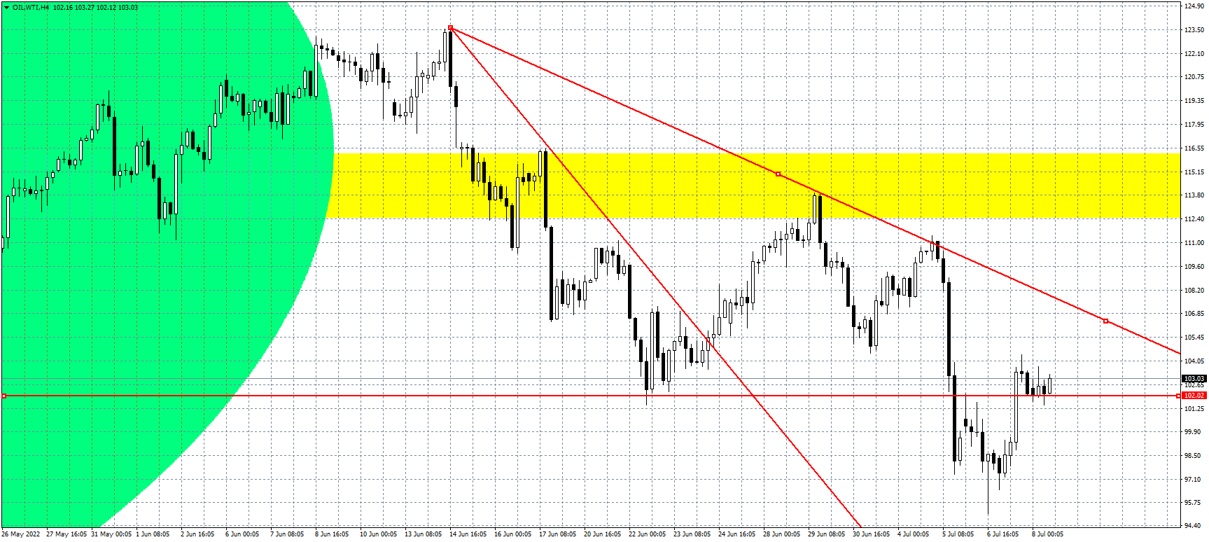 Jesteśmy obecnie w momencie, gdy wciąż aktualne zostają zupełnie sprzeczne rekomendacje największych banków inwestycyjnych. Z jednej strony mamy te, które zakładają horrendalne wyceny czarnego złota powyżej 300 dolarów za baryłkę. Z drugiej potencjalna recesja skłania innych do predykcji nawet na poziomie 45 $ na koniec przyszłego roku. I wydaje się, że faktycznie gdzieś pomiędzy tymi pułapami będzie się utrzymywał kurs ropy. A tak na zupełnie poważnie, po wyłamaniu pierwszej fali spadkowej w ostatnim tygodniu czerwca, sytuacja faktycznie zrobiła się poważna. Wyjście z powrotem powyżej 120 $ (dla odmiany WTI) stało się realne, a to miałoby bardzo poważne konsekwencje nie tylko dla tankujących, ale dla całej gospodarki. Na szczęście przedział nabudowany wokół 115 $, wygenerował sygnał podażowy, który chwilę później został potwierdzony kolejną linią trendu. Ostatecznie udało się zejść na chwilę nawet poniżej 95 $ i co by nie mówić, jest to już rozsądna wycena. Reszta rynku uznała podobnie, dlatego został rozegrany impuls popytowy, który znowu zaprowadził nas na trzycyfrowe rejony. Obecnie będziemy testować poziom 102 $, choć niewykluczone, że gdzieś w tej okolicy rynek pokusi się o wakacyjną konsolidację. Byłby to raczej pozytywny sygnał dla banków centralnych, które w spokojniejszych warunkach mogłyby testować wprowadzane przez siebie rozwiązania.