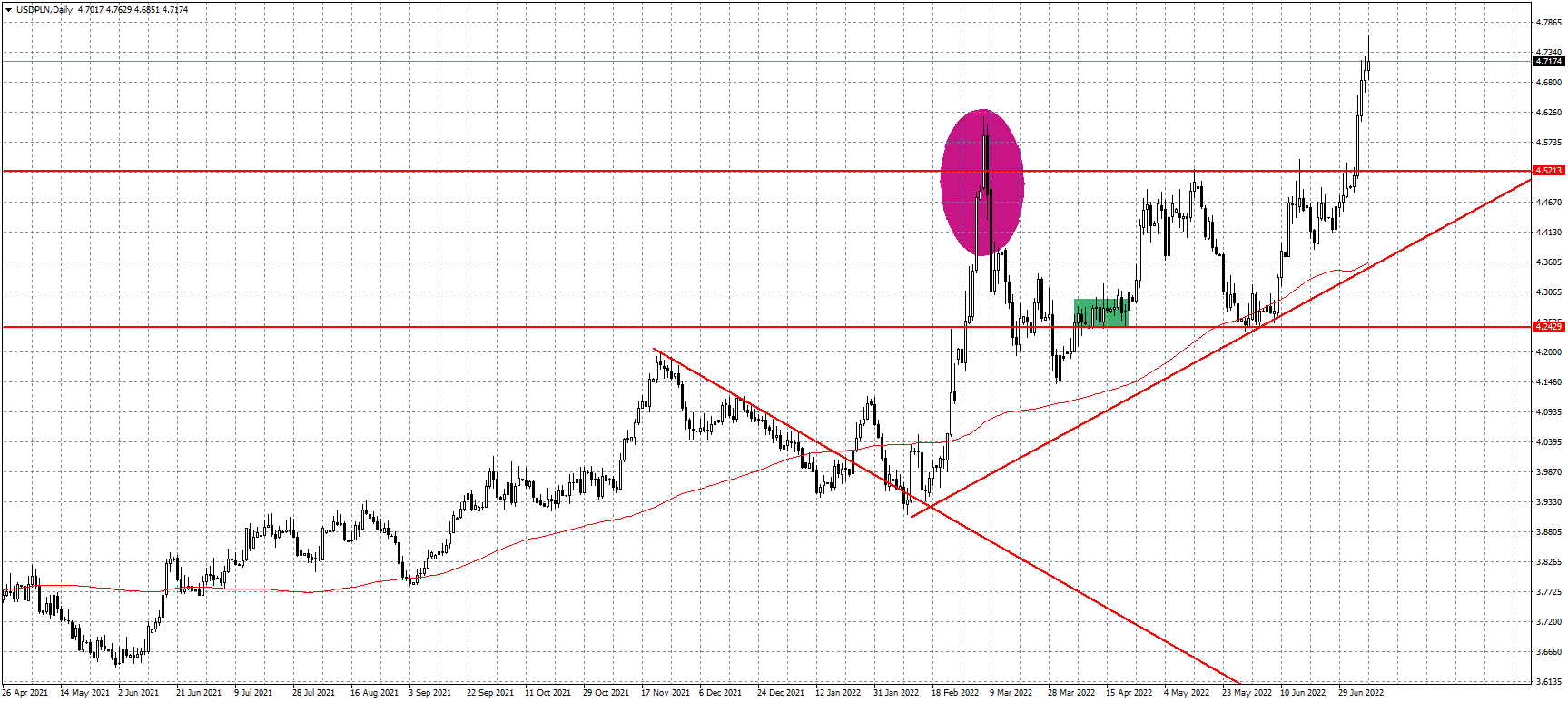 Złoty nie radzi sobie wobec dolara i to zdanie powoli zakrawa na banalny truizm. I choć medialnie głośno się o tym zrobiło na przestrzeni ostatniego miesiąca, to spojrzenie na sprawę z większej perspektywy pokazuje, że problem jest znacznie poważniejszy. Na początku lipca zeszłego roku za zielonego płaciliśmy 3,666 zł i od tego momentu rozpoczął się wręcz tragiczny rajd na tej parze walutowej. Co prawda, pod koniec roku udało się wygenerować większą korektę, ale to było absolutnie wszystko, na co stać naszego złotego. Totalna bezwarunkowa kapitulacja. Złoty stał się pariasem na rynku walutowym, tracąc w 12 miesięcy blisko 30% swojej wartości. Wynik godny tureckiej liry, czy białoruskiego rubla. W tym czasie nie tylko pożegnaliśmy się z mianem lidera naszego koszyka, ale w błyskawicznym tempie osunęliśmy się na koniec stawki, nawet biorąc pod uwagę tylko nasz region. Niestety deprecjacja naszej waluty tylko przybiera na sile i tak jak jeszcze na początku czerwca dolar kosztował 4,24 zł, tak już na przełomie wakacyjnych miesięcy testował opór przy 4,50 zł. Gdy ten w końcu został pokonany, błyskawiczne kurs został wywindowany do 4,78 zł. W niecały miesiąc przeszliśmy drogę 50 groszy… Oczywiście dolar obecnie jest najdroższy wobec złotego w historii i nasza waluta raczej nie ma argumentów, by tę sytuację zmienić.