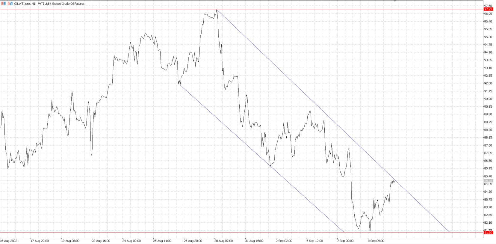 Dziś warto także wspomnieć o ropie, która w tym tygodniu kontynuowała ruch w kanale spadkowym. Poruszanie się w kierunku południowym trwa od końca sierpnia. Najniższą wycenę w ciągu ostatnich pięciu dni indeks OIL WTI osiągnął w czwartek przed południem. Jego wartość wynosiła wtedy niecałe 82 $. Co ciekawe, ostatni raz na podobnych poziomach znajdowaliśmy się w połowie stycznia tego roku. Pierwszą przyczyną spadków “czarnego złota” jest wszechobecna obawa przed globalną recesją. Dodatkowo w poniedziałek dowiedzieliśmy się, że OPEC+ postanowił zmniejszyć produkcję ropy o 100 tys. baryłek dziennie. Nie jest to znaczne ograniczenie podaży, bo stanowi zaledwie 0,1% światowego popytu na październik, jednak inwestorzy uznali to za jasny komunikat, w którą stronę spogląda kartel. W piątek po południu kurs OIL WTI wynosi niecałe 85$ za baryłkę, niebezpiecznie zbliżając się do górnej granicy kanału, w którym znajduje się od końca sierpnia.