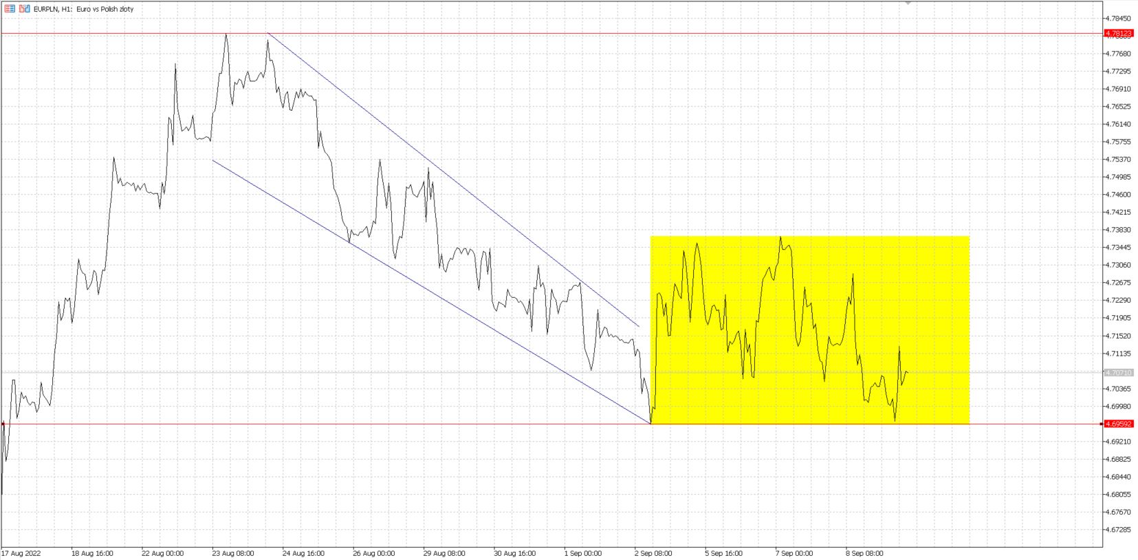 Sytuacja techniczna na wykresie EUR/PLN jest dość spokojna. Poniedziałek okazał się być zakończeniem dwutygodniowego umacniania się PLN w stosunku do wspólnej waluty. Aktualnie znajdujemy się w trendzie bocznym. Trwa konsolidacja pomiędzy poziomami 4,696 PLN a 4,736 PLN. Na początku tygodnia nastąpiła podwójna próba przebicia poziomu ok 4,736 PLN. Obydwa podejścia okazały się być nieudane. W środę, 7 września po wyznaczeniu podwójnego szczytu na wspomnianym wcześniej poziomie nastąpiło lekkie umocnienie złotego. Mogło mieć to związek ze środowym podwyższeniem stóp w Polsce o zapowiadane 25 pb. Nie doprowadziło to jednak do znaczącej zmiany trendu. W piątek po południu wspólna waluta umacnia się do polskiego orła. Kurs EUR/PLN znajduje się w okolicach poziomu 4,722 PLN.