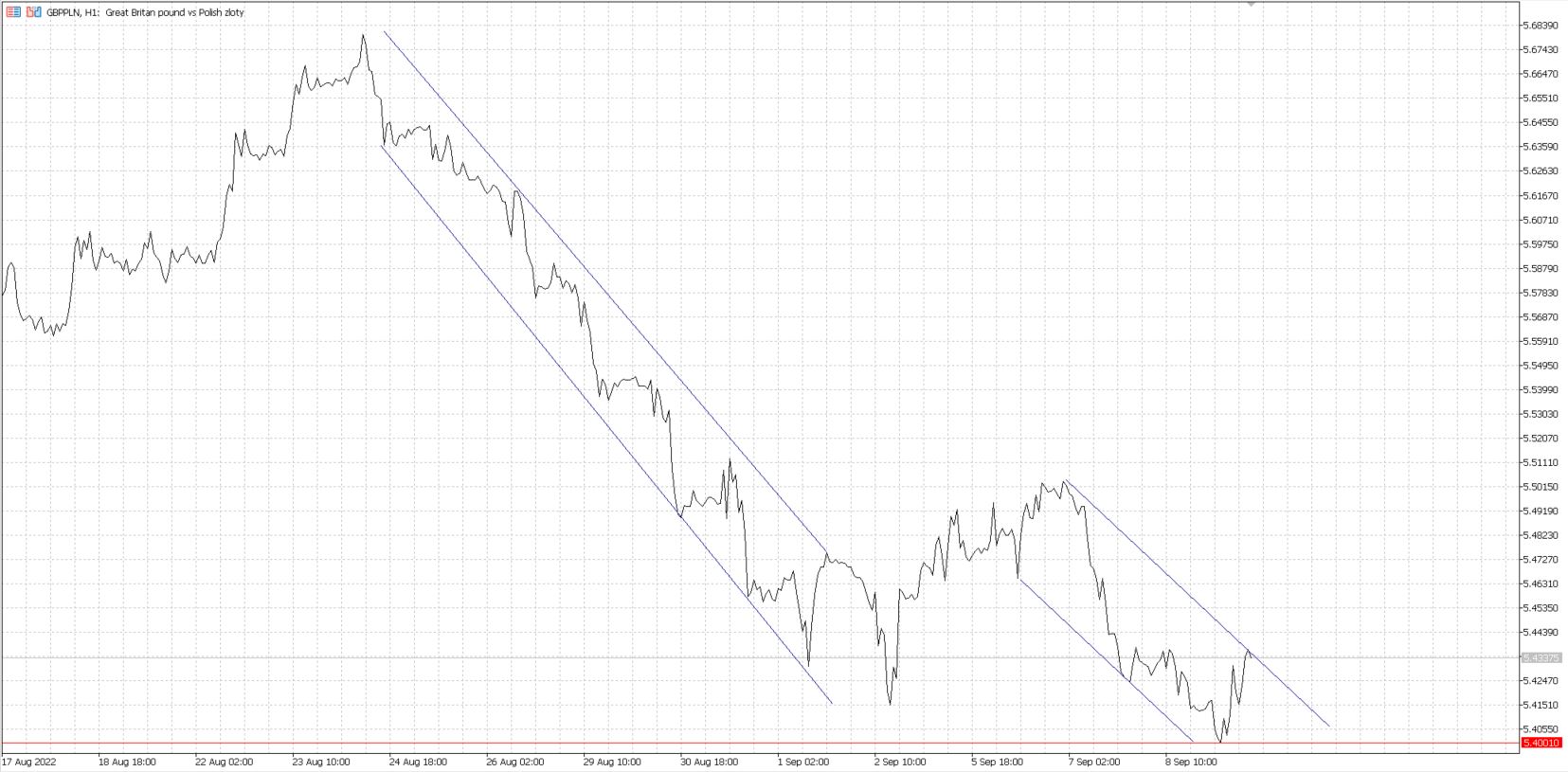 Na wykresie GBP/PLN możemy zauważyć zalążek formowania się kolejnej fali spadkowej. Na początku tygodnia wydawać się mogło, że ruch w kierunku południowym zostanie zakończony. W poniedziałek oraz wtorek zauważyliśmy jednak odbicie się kursu od oporu 5,415 PLN za jednego funta. Umocnienie GBP miało zapewne związek z wyborem nowej premier w Wielkiej Brytanii. Została nią Liz Truss, która według swoich postulatów zamierza zwalczyć trwający kryzys, nie doprowadzić do recesji i wygrać z rozpędzoną na Wyspach inflacją. Sytuacja polityczna nareszcie się wyklarowała, dlatego w oczach inwestorów funt stał się bezpieczniejszy i bardziej atrakcyjny. Jak się później okazało tylko na chwilę. W środę na wykresie GBP/PLN doszliśmy do poziomów 5,503 PLN, co było wyznaczeniem lokalnego szczytu. Od tego czasu złoty ponownie zaczął się umacniać. Oprócz środowej podwyżki stóp procentowych w Polsce, na korzyść PLN działało także umocnienie się euro w stosunku do dolara. Przypomnimy, że rodzima waluta wykazuje dodatnią korelację do EUR. Tak było i w tym tygodniu. W piątkowe popołudnie kurs GBP/PLN jest na poziomach ok. 5,431 PLN.