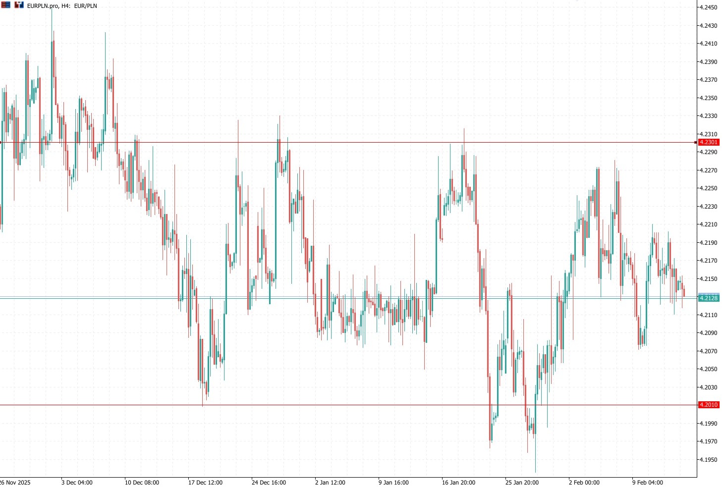 Wykres kursu euro do złotego, interwał 4-godzinowy