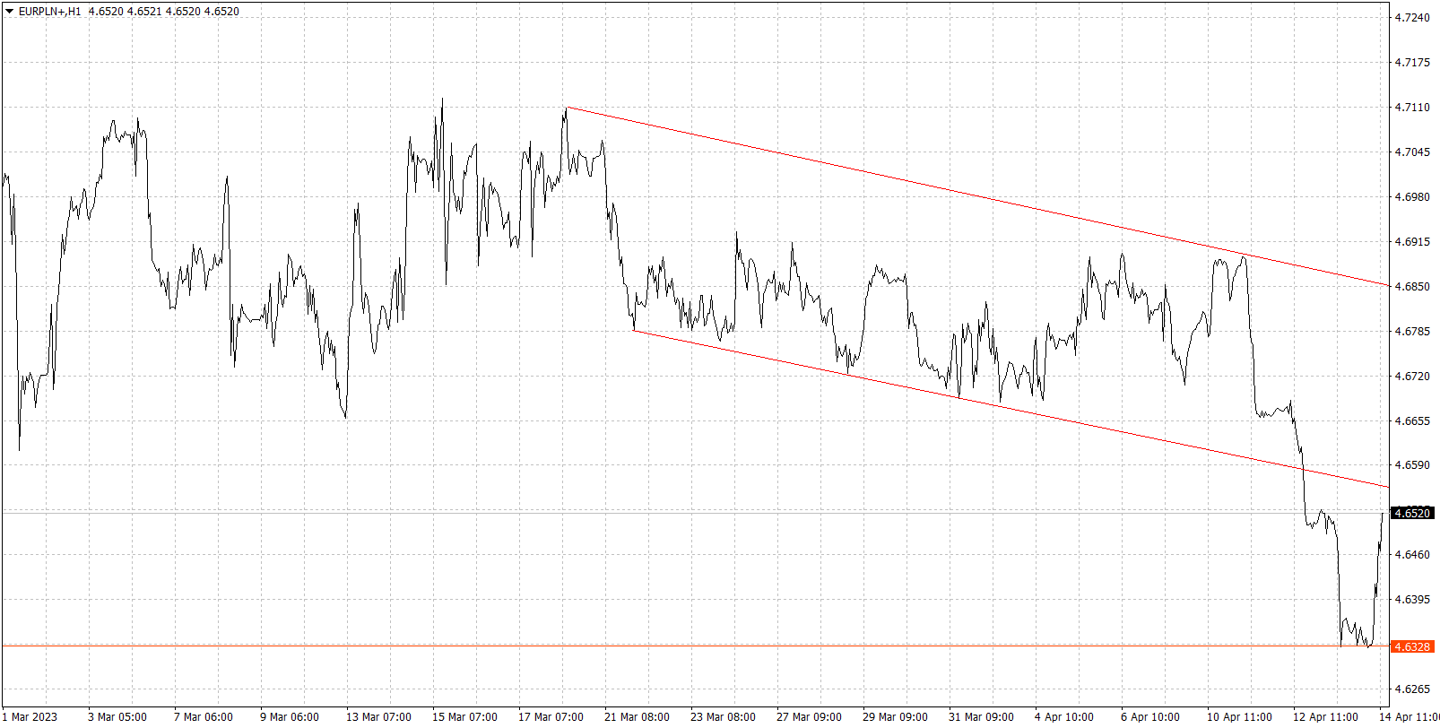 Wykres kursu euro do złotego, interwał 1-godzinowy