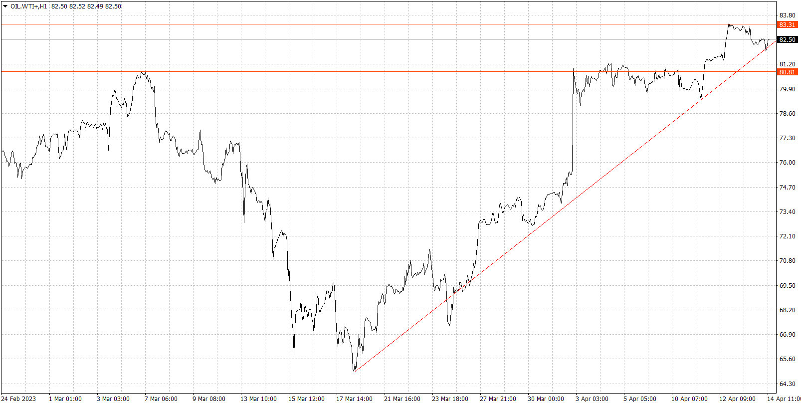 Wykres kursu ropy WTI, interwał 1-godzinowy