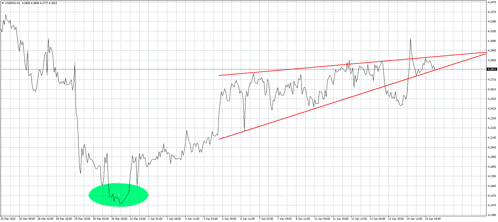Zupełnie inaczej wygląda sytuacja na parze z dolarem. Ten w przeciwieństwie do europejskiego odpowiednika podjął rękawicę i stanął do walki z inflacją. Można dyskutować, czy nie za późno, jednak ciężko oprzeć się wrażeniu, że obecnie to FED wziął na siebie ciężar walki z rozpędzoną dynamiką cen. Majowa podwójna podwyżka stóp procentowych jest już praktycznie przesądzona, kolejne dwa podobne ruchy w najbliższym czasie są mocno prawdopodobne. Do tego już teraz zapowiedziano schodzenie z rozdmuchanego bilansu Rezerwy i to w tempie blisko 100 mld dolarów miesięcznie. Przy takich posunięciach absolutnie normalnym jest aprecjacja dolara, którą ostatnio ewidentnie obserwujemy. Od dołka na koniec marca, kurs USDPLN podskoczył już blisko 15 groszy. Co więcej, od dwóch tygodni widzimy rysującą się formację trójkąta, która jest coraz bliżej rozwiązania. W tym tygodniu dwukrotnie obserwowaliśmy próbę jej wybicia i choć żadna trwałego skutku nie przyniosła, pokazuje to, że jesteśmy już blisko. Zresztą zwężający się kanał potencjalnych ruchów również sugeruje, że już w przyszłym tygodniu możemy być świadkami dynamicznego wybicia. Zgodnie z teorią opisywana formacja zapowiada kontynuację trendu, co może skutkować dotarciem znowu gdzieś w okolice pod 4,40 zł. Warto jednak pamiętać, że już teraz znajdujemy się na pułapie dosyć istotnym historycznie, który kilka razy był w stanie zmieniać reguły gry.