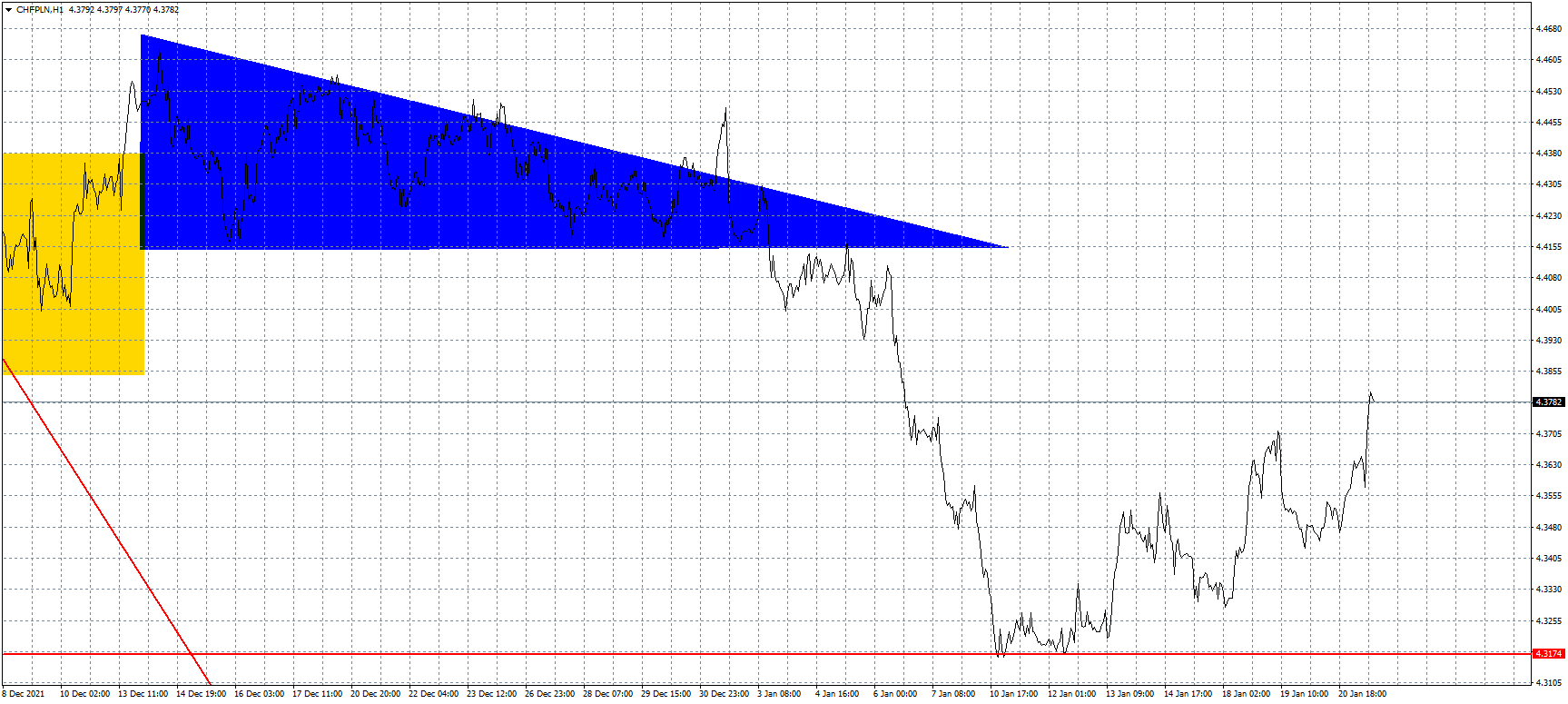 Frank szwajcarski ostatnio nam się rozhulał. Koniec roku to całkiem spora formacja trójkąta, która w końcu została wybita dołem. Po późniejszym wręcz książkowym reteście ruszyli dynamicznie w dół i waluta helwetów, która jeszcze niedawno biła rekordy, nagle znalazła się nieopodal 4,30 zł. Był to najniższy poziom od końca października, a w międzyczasie przecież zahaczyliśmy o 4,50 zł. Od dołka z 10 stycznia frank jednak odrobił już ponad 6 groszy i wiele wskazuje na to, że dąży do powrotu w okolice przynajmniej dolnego ograniczenia formacji trójkąta z końca ubiegłego roku. Jak na razie trend wydaje się co najmniej solidny, dlatego niewykluczone, że pociągniemy jeszcze wyżej. Szwajcarom znów pomagają globalne czynniki oraz łatka bezpiecznej przystani. Dodatkowo nie są oni naznaczeni piętnem inflacji, co z drugiej strony w końcu uświadomi inwestorom, że to wybrzeże, choć teoretycznie zaciszne, to absolutnie mało owocne.