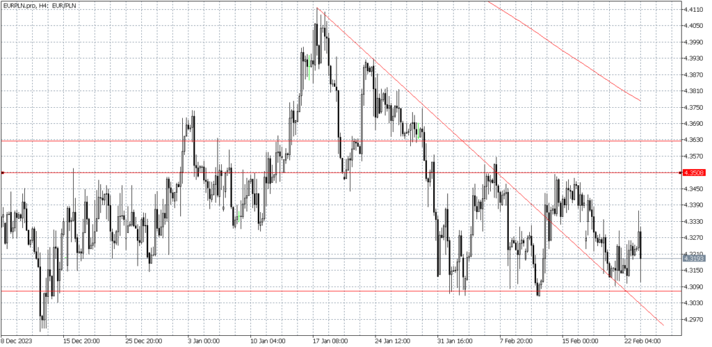 Wykres kursu euro do złotego, interwał 4-godzinowy.
