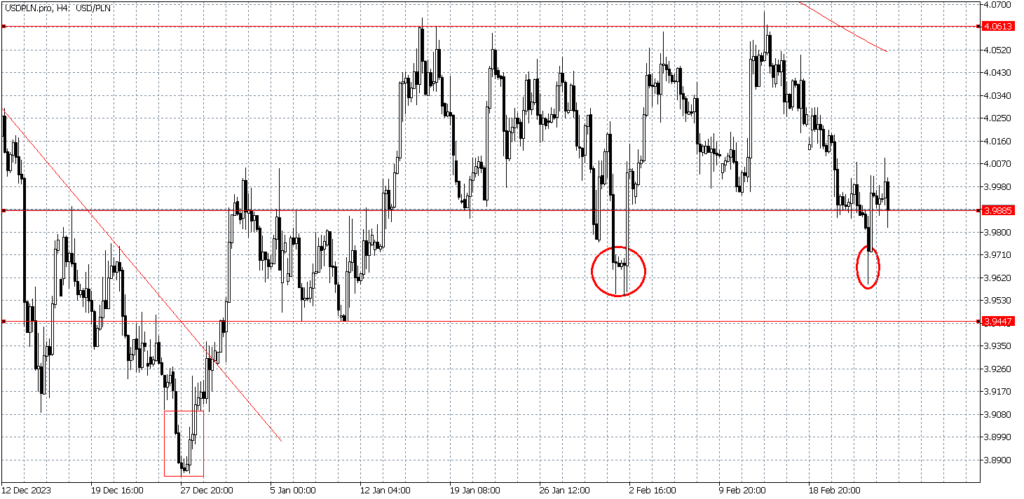 Wykres kursu dolara do złotego, interwał 4-godzinowy.