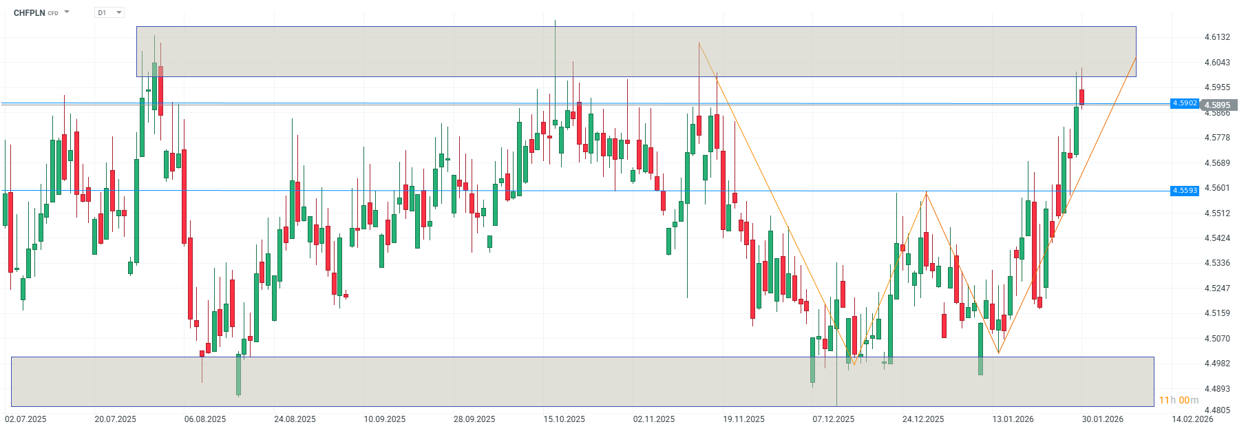 Wreszcie czas na walutę, która ostatnio jest w niezwykłym gazie na szerokim rynku. Tutaj pominiemy fundamentalne argumenty za przepływem kapitału w kierunku szwajcarskiego franka, ale trzeba wspomnieć, że CHF jest aktualnie rekordowo silny wobec EUR czy USD (oprócz krótkiego epizodu w 2011 roku). Wracając do samego CHF/PLN, to wobec siły franka na szerokim rynku złoty radzi sobie z nim bardziej niż przyzwoicie. Ostatecznie kurs CHF/PLN pozostaje w już 10-miesięcznej konsolidacji, ale w jej ramach zrealizował bardzo popularną formację podwójnego dna. Zwracam na nią uwagę, ponieważ w wypadku powyższego wykresu bardzo ładnie zarysował się charakterystyczny dla tej formacji kształt litery „W”. Dołki wypadły tutaj idealnie w rejonie dolnego ograniczenia średnioterminowego trendu bocznego. Zwyżka wynikająca z realizacji podwójnego dna sięgnęła już 4,60 PLN. I tutaj leży główny problem przed kontynuacją kierunku północnego. Nie dość, że właśnie widzimy wypełnienie zasięgu opisanej formacji (odległość pomiędzy linią dwóch minimów a najwyższym punktem odmierzona od szczytu), to w tym miejscu napotkamy też górne ograniczenie konsolidacji. Jej wyłamanie oznacza szansę podejścia pod zeszłoroczne szczyty w pobliżu 4,66 PLN. Bardziej prawdopodobne wydaje się jednak na ten moment potwierdzenie trwałości trendu bocznego i powrót kursu CHF/PLN w obszar jego równowagi wokół 4,56 PLN.