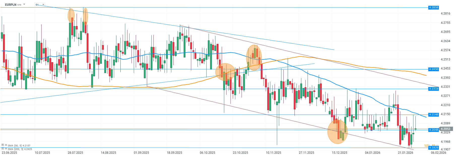 Chociaż para EUR/PLN znana jest ze swojej stabilności (spekulanci określają to raczej nudą), to po okresie kilku miesięcy konsolidacji ten spokój przerodził się po prostu w nowy trend. Jego zachowanie diametralnie odbiega od gwałtowności wydarzeń na EUR/USD. Od początku trendu zniżkowego (koniec września) kurs euro pokonał ledwie 6 groszy, czyli raptem 1,5% w cztery miesiące. Ta wolna, ale stabilna tendencja, uchwycona w korytarzu spadkowym o lekkim nachyleniu sugeruje nam dalszy marsz w dół. Tym bardziej, gdy zauważymy, że kurs EUR/PLN porusza się głównie bliżej dolnego ograniczenia południowego korytarza. Aktualny lokalny (i zarazem najniższy od marca) dołek wypada lekko powyżej 4,19 PLN. W dalszym ciągu można mieć wątpliwości, czy ostatnie ruchy rzeczywiście naruszyły wsparcie, które stanowią świeczki z wiosennego trendu zwyżkowego. Jeśli złoty będzie kontynuował to powolne natarcie, to coraz szerzej otwiera się ścieżka dojścia w rejon zeszłorocznych minimów w obszarze 4,13-4,16 PLN. Korekta może napotkać problem już w rejonie 4,205-4,215 PLN, a następnie powyżej 4,23 PLN. Scenariusz bazowy to kontynuacja z delikatnymi kontrami.