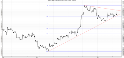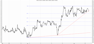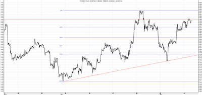 Podobnie jak na pozostałych omawianych walutach, trend spadkowy na parze USD/PLN zakończył się wraz z początkiem kwietnia. Trend wzrostowy zapoczątkowany na początku poprzedniego miesiąca jest nadal kontynuowany. Co prawda na początku zeszłego tygodnia nastąpiła znaczna korekta tego ruchu, ale została ona zatrzymana na wsparciu w okolicach poziomu 3,77. Po odbiciu od linii wsparcia w ciągu tygodnia kurs powędrował w okolice oporu na poziomie 3,89. Jeżeli poziom ten zostanie przebity to otworzy się droga ku lokalnemu maksimum w okolicach poziomu 3,92. Wsparciem dla tego ruchu jest 23,6 poziom zniesienia Fibonacciego w okolicach 3,87.