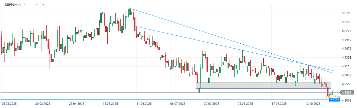 Na koniec zostawiłem parę, do której rzadko zaglądamy, ale która jako jedyna daje nam tak pożądaną w ostatnim czasie na forexie zmienność. Funt przeżywa w ostatnich miesiącach bardzo ciężkie chwile i nie bez obaw oczekuje na przedstawienie przez brytyjski rząd budżetu na kolejny rok. Chociaż trend spadkowy na GBP/PLN jest zauważalny, to także ta para utknęła na jakiś czas w konsolidacji (która miała jednak cały czas inklinacje spadkowe), której dolne ograniczenie w rejonie 4,84-4,86 zł było w stanie stawiać opór przez kilka tygodni. Jednak słabość szterlinga na szerokim rynku musiała wreszcie znaleźć przełożenie także na kursie funta. W ten sposób rynek wyznaczył nie tylko tegoroczne, ale zarazem blisko 5-letnie minima w pobliżu 4,81 zł. W ostatnich dniach widzimy lekkie odreagowanie po wyjściu dołem z trendu bocznego, ale kontra jest bardzo rachityczna. Jeśli GBP/PLN wróci do spadków, to ciekawymi miejscami do obserwacji staną się okolice 4,79 zł, po pokonaniu których otworzy się szansa podejścia nawet do 4,73 zł. Oporem w trwalszym odbiciu na północ będzie wcześniejsze dolne ograniczenie lokalnej konsolidacji, następnie linie wyznaczające trend spadkowy, a wreszcie (chociaż droga daleka) kluczowym rejonem ma szansę stać się 4,96 zł. A stamtąd jak wiadomo już tylko krok do psychologicznego okrągłego 5 zł.