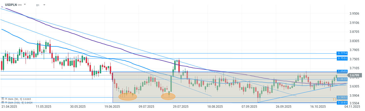 Skoro nadszedł czas na wypadkową kursów EUR/PLN i EUR/USD, czyli USD/PLN, to nikogo nie powinno specjalnie dziwić, że również tutaj w dalszym ciągu obserwujemy konsolidację. Wraz z zachowaniem dolara na szerokim rynku także w wypadku tej pary widzimy umocnienie „zielonego”, ale bez rozstrzygnięcia na eurodolarze także tutaj nie dojdzie do przełomu. Dlatego wciąż trzyma się górne ograniczenie trendu bocznego poniżej 3,70 zł. Wyjście górą może dać szansę na atak na letnie szczyty powyżej 3,75 zł, po których trudnym rejonem do przełamania mogą być okolice dołków z 2024 roku przy 3,77-3,78 zł. Jeżeli żaden z tych oporów nie wytrzyma, to nasz wzrok powinien kierować się na okolice 3,83-3,84 zł. Co w przypadku zanegowania aktualnego wyjścia na północ? Najpierw wsparcia możemy szukać w średnich sesyjnych, które teraz wypadają wokół 3,64 zł. Następnie ciekawym rejonem może być już 3,61 zł, poniżej którego nie udało się zejść USD/PLN już od kilku tygodni. Ostatecznie kluczowe wsparcie to rejon tegorocznych minimów 3,56-3,58 zł. Czy tak znacząca słabość dolara jest możliwa w najbliższym czasie? Na razie mało na to wskazuje, więc scenariusz bazowy (oczywiście przy braku rozstrzygnięcia na EUR/USD) to kontynuacja konsolidacji.