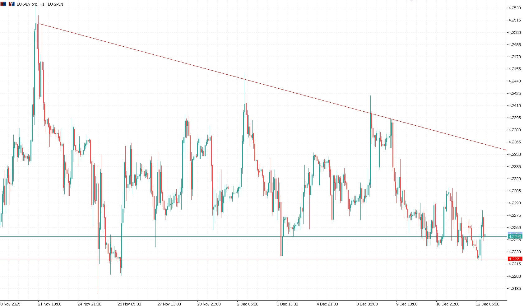 Grudniowa siła złotego rysuje się także na USD/PLN. Na wykresie widać ewidentny trend spadkowy. Przez ostatnie dwa tygodnie ukształtowała się formacja trójkąta zniżkującego. Zgodnie z jej teorią – wspomnianą w poprzednim akapicie – w środę doszło do przełamania jej wsparcia przy 3,62 PLN. Zniżka nastąpiła wskutek publikacji decyzji o redukcji kosztu pieniądza w Stanach Zjednoczonych. Niższy koszt pieniądza w USA osłabił amerykańskiego dolara. Po zejściu poniżej wsparcia nastąpił jego retest, który został wybroniony. Dalsza historia to spadek kursu USD/PLN. Wczoraj notowania chwilowo naruszyły poziom 3,60 PLN. Dziś oscylujemy wokół niego. Słabość dolara w połączeniu z siłą PLN daje obniżenie kursu USD/PLN. Jeżeli miałoby nastąpić dalsze osuwanie się notowań, kolejnym przystankiem będzie wsparcie 3,56 PLN, widziane ostatnio w połowie września. W przypadku krótkoterminowej zwyżki, notowania będą próbować sforsować 3,62 PLN, który w tym tygodniu ze wsparcia zmienił się w opór.