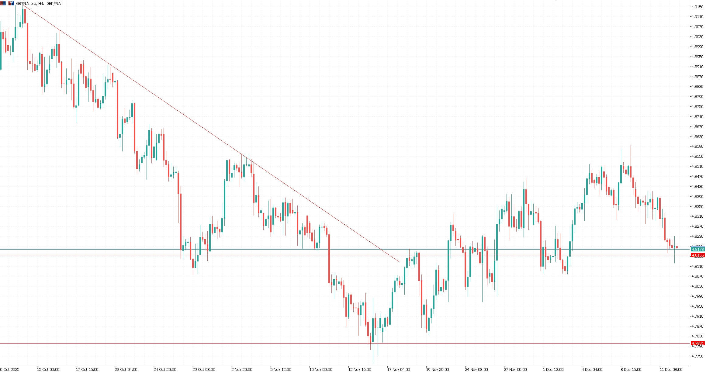Nieco odmienną sytuację obserwujemy na wykresie funta do złotego. Jeszcze do niedawna brytyjska waluta nie mogła poradzić sobie z październikową linią trendu spadkowego. W połowie listopada notowania osiągnęły lokalne dno przy 4,77 PLN, po czym rynek jakby powiedział „to już zbyt nisko”. Następnie pojawili się kupujący zainteresowani tanim funtem. Zbiegło się to z uchwaleniem budżetu na nowy rok fiskalny w Wielkiej Brytanii, który wbrew wielu obawom okazał się mniej negatywny, niż spodziewali się tego forexowi inwestorzy. Dodatkowo ostatni delikatny spadek inflacji z 3,8% r/r na 3,6% r/r daje nadzieje na możliwą obniżkę stóp na Wyspach. Najbliższa decyzja już 18 grudnia. W tym przypadku redukcja kosztu pieniądza uznawana jest za ulgę dla funta, gdyż stanowiłaby poprawę warunków do rozwoju brytyjskiej gospodarki. Ta jak wiemy zmaga się z wieloma problemami, np. wysokie bezrobocie (5%), kurczący się przemysł czy wolny wzrost PKB. Poprawa perspektyw doprowadziła do ostatniego odbicia kursu GBP/PLN, który na początku mijającego tygodnia wyznaczył swoje lokalne maksimum przy 4,86 PLN. Po jego osiągnięciu nastąpiło odreagowanie, które ostatecznie przerodziło się w spadki. W piątek kurs GBP/PLN wrócił do 4.815 PLN, a kalendarz makroekonomiczny po raz kolejny brutalnie przypomniał wszystkim o technicznym osłabieniu wyspiarskiej gospodarki. Kwartalne PKB za spada o 0,1%. Kurczy się także produkcja przemysłowa, która licząc październikowy spadek o 0,8% r/r jest czwartym z kolei odczytem poniżej kreski. Mimo słabych danych na wykresie nie schodzimy poniżej wsparcia 4,815 PLN, co pozostawia funtowi nadzieję na odbicie.