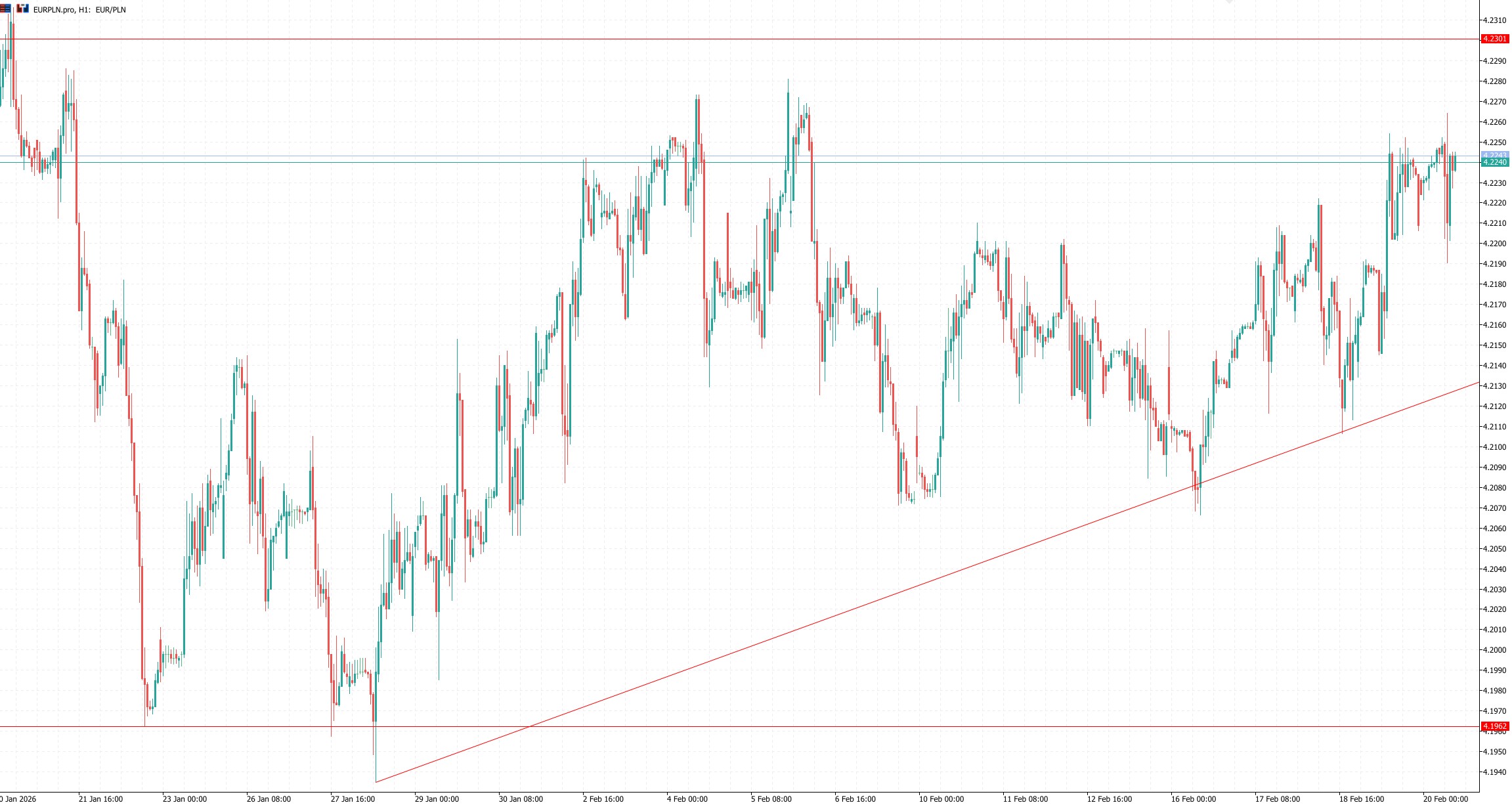 Para EUR/PLN od końca stycznia znajduje się w wyraźnym trendzie wzrostowym, choć jego najważniejsze akordy wybrzmiały na przełomie miesiąca, to wykres wciąż pozostaje nachylony w górę. Kolejne cofnięcia kursu w dół kończą się odbiciem od linii trendu – cena ją szanuje i wraca do wzrostów. To klasyczny sygnał, że kupujący euro mają kontrolę nad rynkiem. Obecnie najważniejszy opór znajduje się tuż nad obecnym notowaniem w okolicach 4,23 zł – to psychologiczna bariera, której para jeszcze nie przebiła na trwałe. Widzimy kilka „szpilek” w górę do poziomu 4,2280-4,2290, ale za każdym razem następował szybki powrót. Względne wsparcie techniczne mamy na 4,2245 zł, jednak ważniejszy będzie poziom 4,213 zł, gdzie obecnie znajduje się linia trendu. Ostatnie rozczarowujące dane z polskiej gospodarki (produkcja przemysłowa -1,5%, płace +6,1%) dają dodatkowy impuls do osłabienia złotego. Dopóki para porusza się powyżej linii trendu, scenariusz pozostaje byczy z potencjałem przebicia 4,23 zł i dalszego marszu w kierunku 4,25-4,26 zł. Złamanie linii trendu w dół byłoby pierwszym sygnałem zmiany nastawienia.