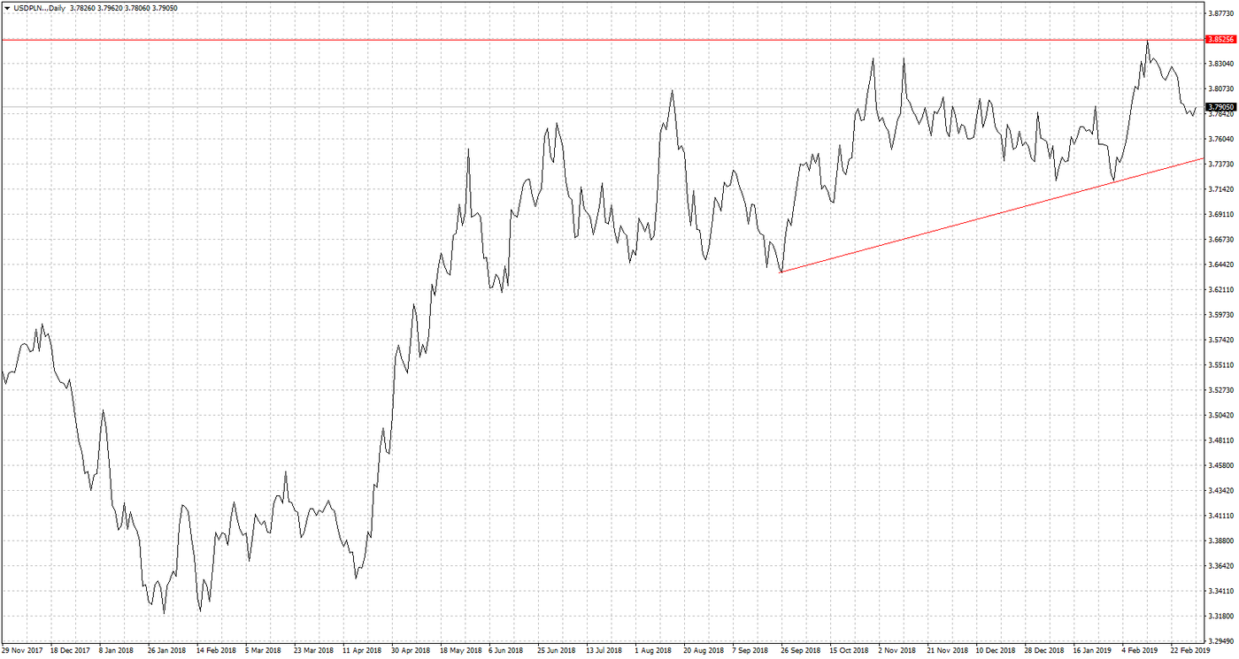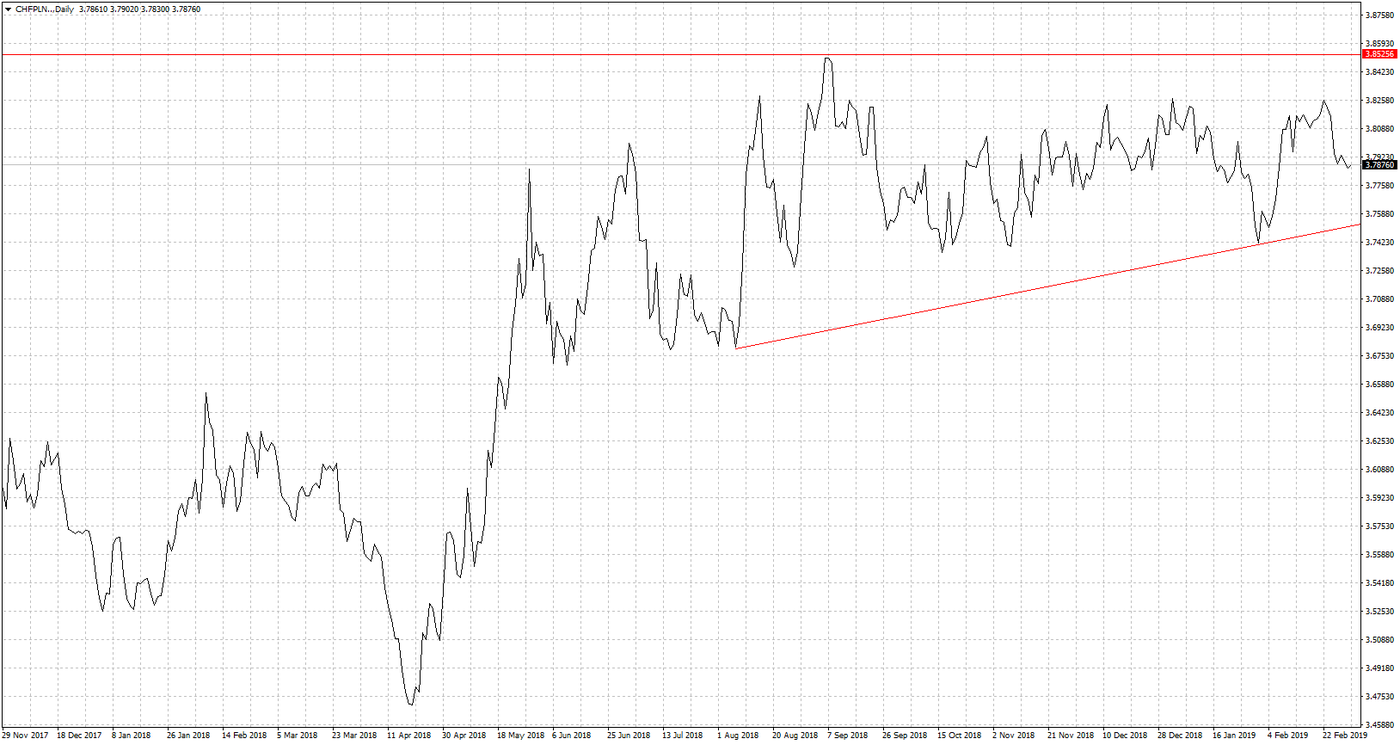Lepszy klimat inwestycyjny na rynkach widać również po notowaniach pary CHF/PLN. Kurs w dniu dzisiejszym zszedł poniżej granicy 3,80. Na końcu lutego były to poziomy nawet 3,85. Czy najgorszy czas już za nami to można mieć nadal wątpliwości. Owszem, patrząc od strony gracza giełdowego, to zagrożenia na rynkach nie widać indeksy niemal codziennie osiągają nowe maxy w tym roku. Patrząc jednak na dane wcale już tak różowo nie jest. PMI chiński nadal poniżej 50 pkt, nie mówiąc już o wskaźnikach dla gospodarki niemieckiej gdzie nastąpiła kolejna fala pogorszenia. Nadal też można mieć wątpliwości odnośnie umowy USA z Chinami. Początek tygodnia to raczej myślenie, że niemal dojdzie do porozumienia. Ale pamiętajmy jakim przywódcą jest Trump. W jednym tweecie jest w stanie stwierdzić, że nastąpił spory postęp po czym pisze, że wcale umowa nie musi być zawarta. Pozostaje więc pytanie co będzie sukcesem prezydenta USA, czy pokazanie światu, że to on rządzi i wprowadzenie jednak dodatkowych ceł, czy jednak za sukces ogłosi podpisanie porozumienia. Punktów zapalnych na świecie więc cały czas jest sporo, więc odreagowanie na parach powiązanych z walutami uznawane za bezpieczne mogą być krótkotrwałe. Pierwszym wsparciem dla CHF/PLN będzie 3,7560.
