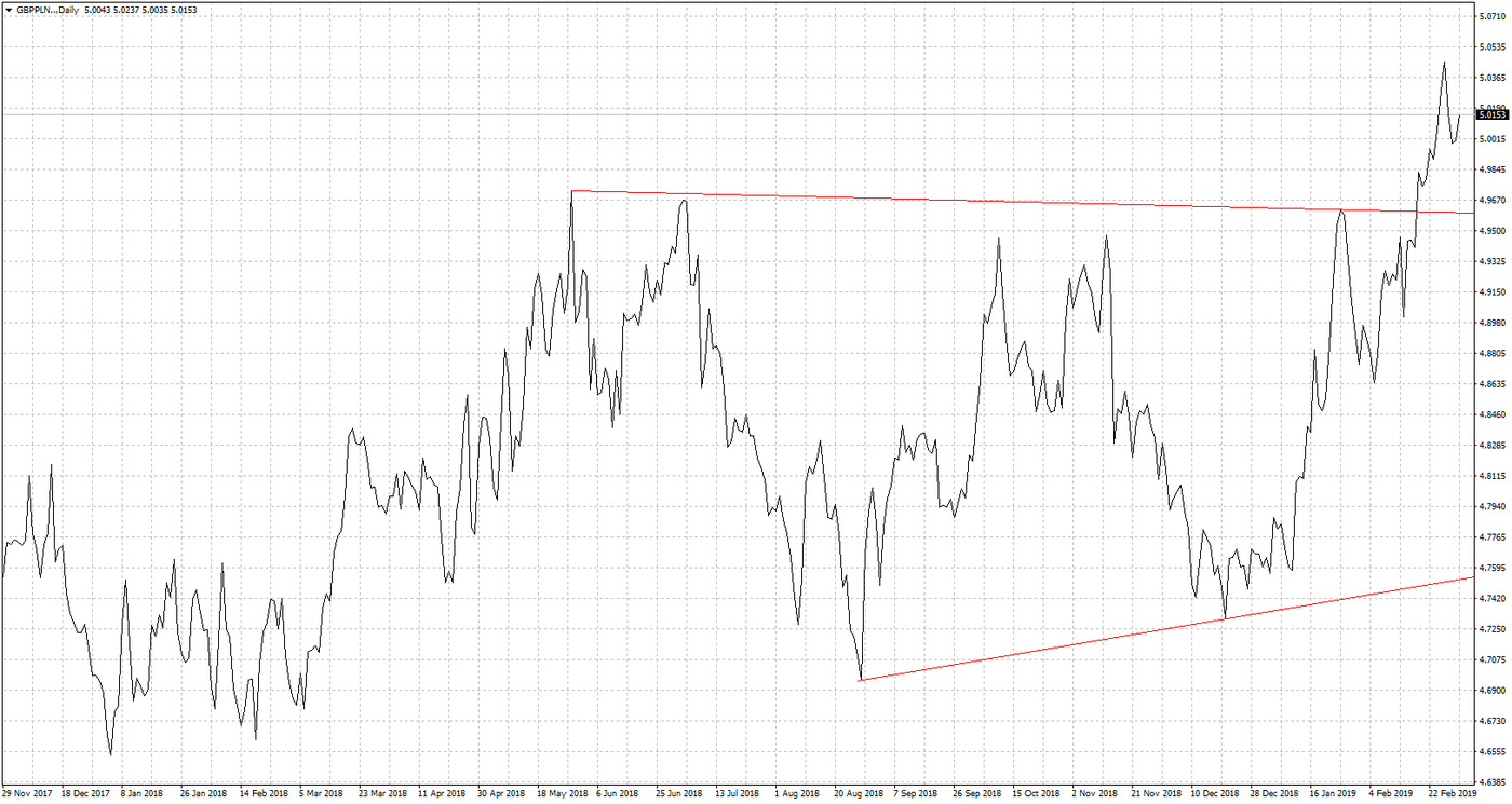 Jeśli chodzi o GBP/PLN to tutaj akurat złotówka notuje straty a kurs porusza się w dość silnym trendzie wzrostowym. Na parach powiązanych z funtem ruchy determinuje temat brexitu. Rynki dość optymistycznie ostatnio podchodzą do tego tematu zupełnie zaskakująco. Bo niemal pewne przedłużenie terminu negocjacji tak naprawdę niczego nie wnosi, problemy cały czas pozostają a układ głosów w Izbie Gmin nie zwiastuje nagłego zatwierdzenia porozumienia wypracowanego przez May z UE. Ostatnich nowych informacji tak naprawdę brakuje, a kluczową datą pozostaje 12 marca, wtedy to dojdzie do głosowania ponownego nad obecną umową. Jeśli zakończy się ono fiaskiem, a to przesądzone niemal, to odbędzie się głosowanie nad przesunięciem daty brexitu. I ten aspekt wywołał tak silne wzrosty funta, bo jednak odsuwa w czasie chaotyczny brexit. Termin miałby być przesunięty do 25 maja czyli do daty wyborów do parlamentu europejskiego. Wiele więc może się jeszcze wydarzyć a ruchy na funcie do końca marca mogą być spore.