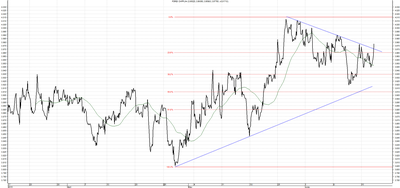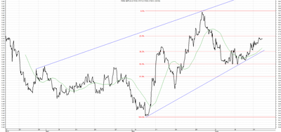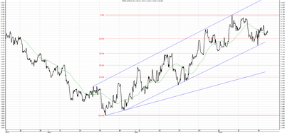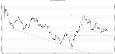 Kurs USD/PLN wybił się z średnioterminowego trendu spadkowego. Aktualnie w ujęciu krótkoterminowym kurs przebił linię oporu na poziomie 3,7000 a następnie osiągnął zniesienie Fibonnaciego 38,2%. W przypadku marszu na północ ważnym oporem będzie ostatnie lokalne maksimum na poziomie 3,8210.