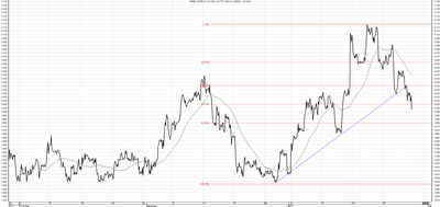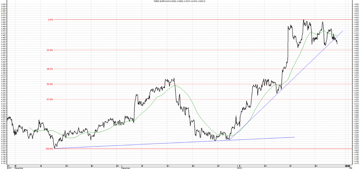 Kurs EUR/PLN powraca do wzrostów. Dla ruchu w górę nowym oporem nie jest już poziom 4,3650, gdzie znajdowało się zarówno maksimum poprzedniego ruchu. Nowym oporem jest obecnie poziom 4,5100 zł gdzie kurs dotarł po obniżce ratingu. W przypadku spadków wsparcie stanowić będą ostatnie minima lokalne na 4,4350.