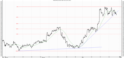 Kurs GBP/PLN od połowy października porusza się w silnym trendzie wzrostowym po czym zawrócił i przeszedł w trend spadkowy. Najbliższym oporem dla ruchu w górę są ostanie maksima na poziomie 5,9100. W przypadku kontynuacji spadków ważnym wsparciem jest minimum obecnego ruchu, czyli poziom 5,7300.