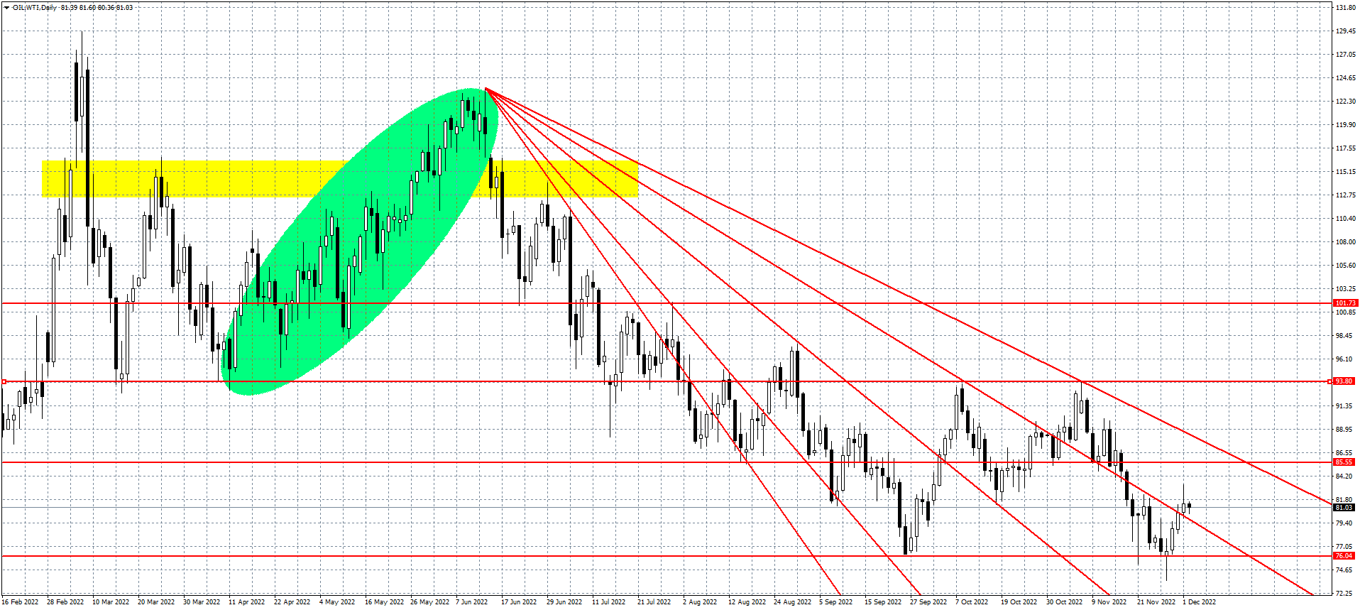 O dalszych losach głównej pary walutowej prawdopodobnie będzie przesądzać nadchodząca recesja. Wydaje się, że jest ona nieunikniona i nadchodzący rok będzie co najmniej trudny (zupełnie, jakby poprzednie lata były łatwe…). Ciekawie wygląda jednak sytuacja na ropie naftowej, która jest całkiem dobrym barometrem nastrojów gospodarczych. Z prostego powodu, że recesja zawsze oznacza ograniczenie popytu i tym samym powinna obniżać cenę czarnego złota. Ta faktycznie znacząco oddaliła się od tegorocznych szczytów wywołanych wojną, jednak w mijających tygodniach możemy zaobserwować rozrysowanie wachlarza puszczonego z ostatniego szczytu. Jest to sygnał, że prawdopodobnie wchodzimy w dłuższy okres bez trendu, lub jak kto woli w trendzie bocznym. Scenariuszem obecnie dominującym, jest poruszanie się w przedziale zawartym między 76 $ – dołki z poniedziałku i końca września, a 85 $ – czyli szczytów z października i listopada. Oba poziomy mają swoje potwierdzenia też we wcześniejszych miesiącach, dlatego powinny wyraźnie ograniczać większe ruchy. Może to oznaczać, że choć recesji prawdopodobnie nie uda się uniknąć, to może być ona raczej płytka i krótka. Jeśli tak będzie, to trend wzrostowy na głównej parze walutowej powinien być kontynuowany.