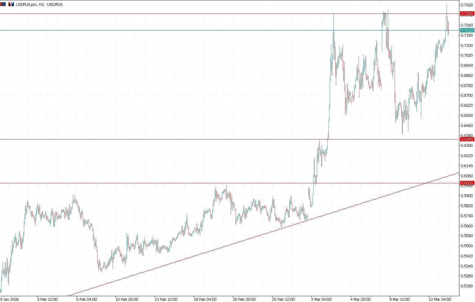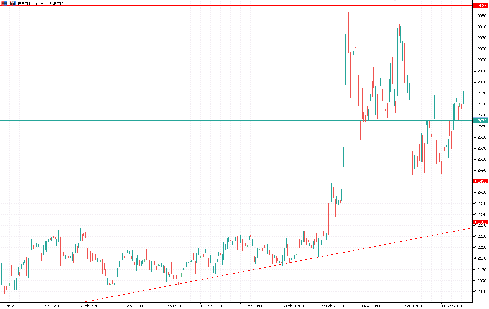 Impakt wydarzeń na Bliskim Wschodzie rozbujał nam nawet notowania EUR/PLN. Pierwsze dwa miesiące roku to nudna konsolidacja między 4,20-4,23 PLN. W lutym dostrzec można było delikatny trend zwyżkujący, który związany był z wizją obniżek stóp procentowych przez Radę Polityki Pieniężnej. Do cięcia doszło, jednak sam ruch nie był powodem istotnego osłabienia krajowej waluty. Do gwałtownego wybicia notowań przyczynił się wybuch wojny, który uderzył w waluty rynków wschodzących. Wśród nich znajduje się polski złoty, od którego inwestorzy odwracają się w niepewnych czasach. Co prawda straty nie są aż tak spektakularne jak podczas wybuchu wojny za naszą wschodnią granicą w 2022 roku, jednak kurs EUR/PLN podczas dwóch pierwszych sesji marca zwyżkował powyżej 4,30 PLN. Dalej obserwowaliśmy odreagowanie, które zakłócały doniesienia o eskalacji konfliktu. Ostatecznie pierwsza połowa miesiąca to niespokojne wahania notowań w szerokim przedziale 4,245 a 4,305 PLN. W momencie pisania niniejszej analizy znajdujemy się dokładnie przy 4,27 PLN. Dodatkowo na wykresie można także dostrzec, że (w odróżnieniu do pierwszych dni marca) w minionym tygodniu znajdowaliśmy się w dolnej części szerokiej konsolidacji.